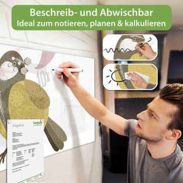 Material: 4mm Sicherheitsglas mit Metallrückwand Eigenschaften: beschreibbar, magnetisch, kratzfest Maße: 100x50x0,6cm, 7,50kg schwer Motiv Nummer 10388 Vogel mit Sprechblase Zubehör: inklusive 4 Neodym-Magnete
