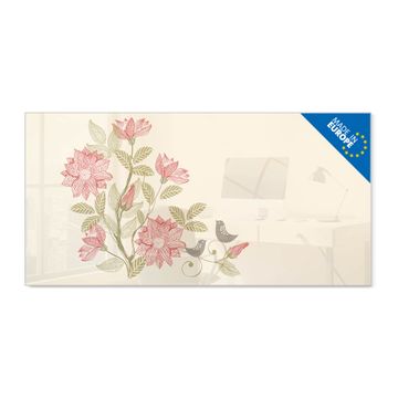 Material: 4mm Sicherheitsglas mit Metallrückwand Eigenschaften: beschreibbar, magnetisch, kratzfest Maße: 100x50x0,6cm, 7,50kg schwer Motiv Nummer 10933 Vogelpaar Zubehör: inklusive 4 Neodym-Magnete