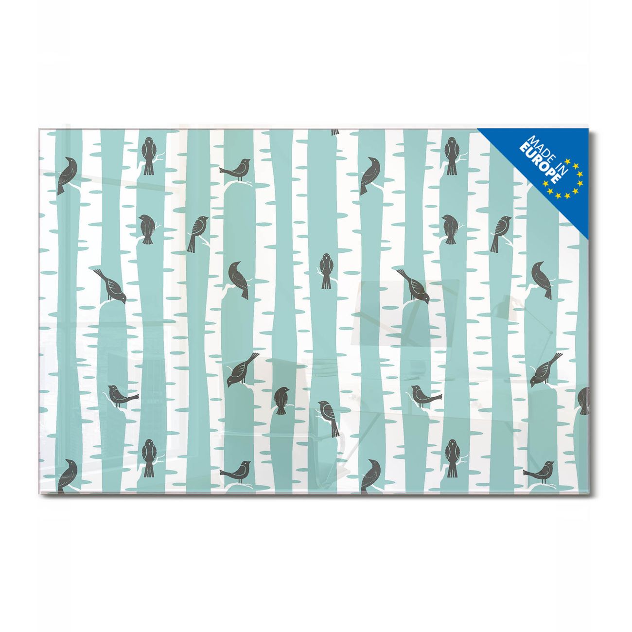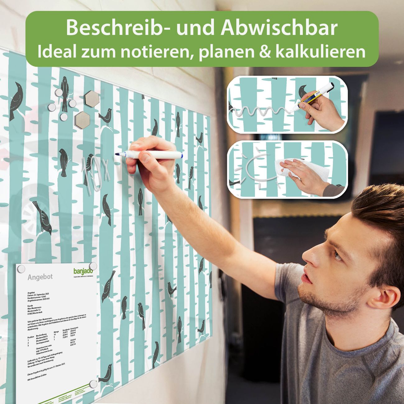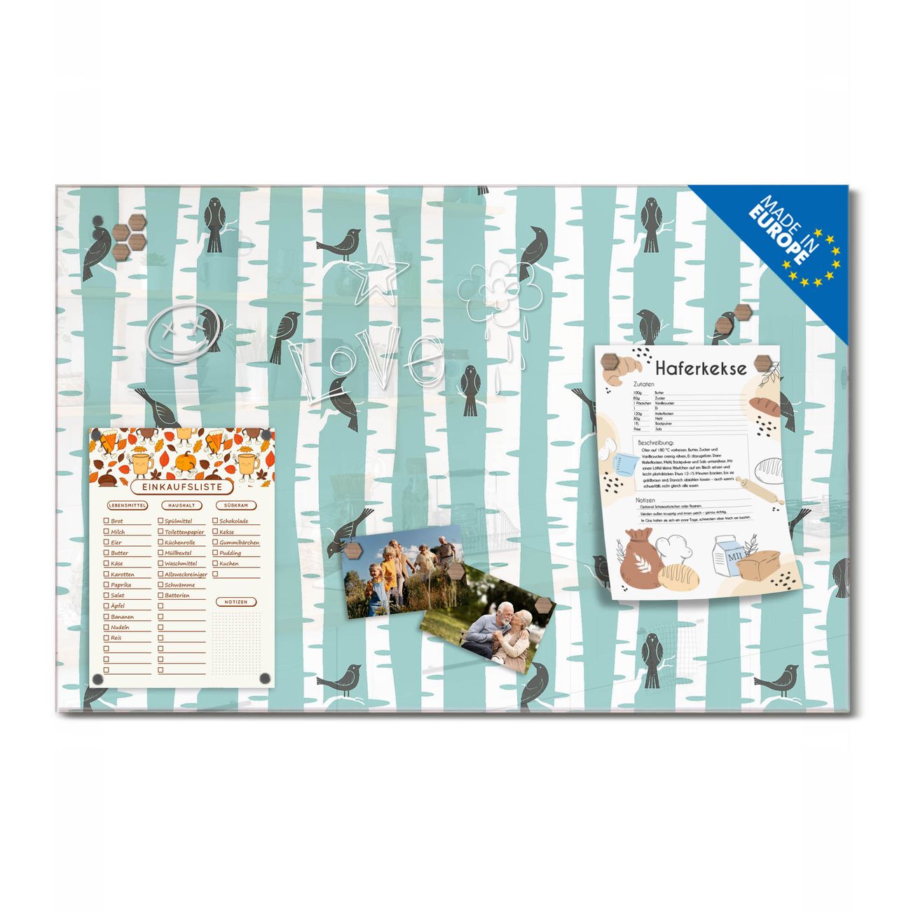 Material: 4mm Sicherheitsglas mit Metallrückwand Eigenschaften: beschreibbar, magnetisch, kratzfest Maße: 45x30x0,6cm, 2,03kg schwer Motiv Nummer 10415 Stare Und Birken Zubehör: inklusive 4 Neodym-Magnete