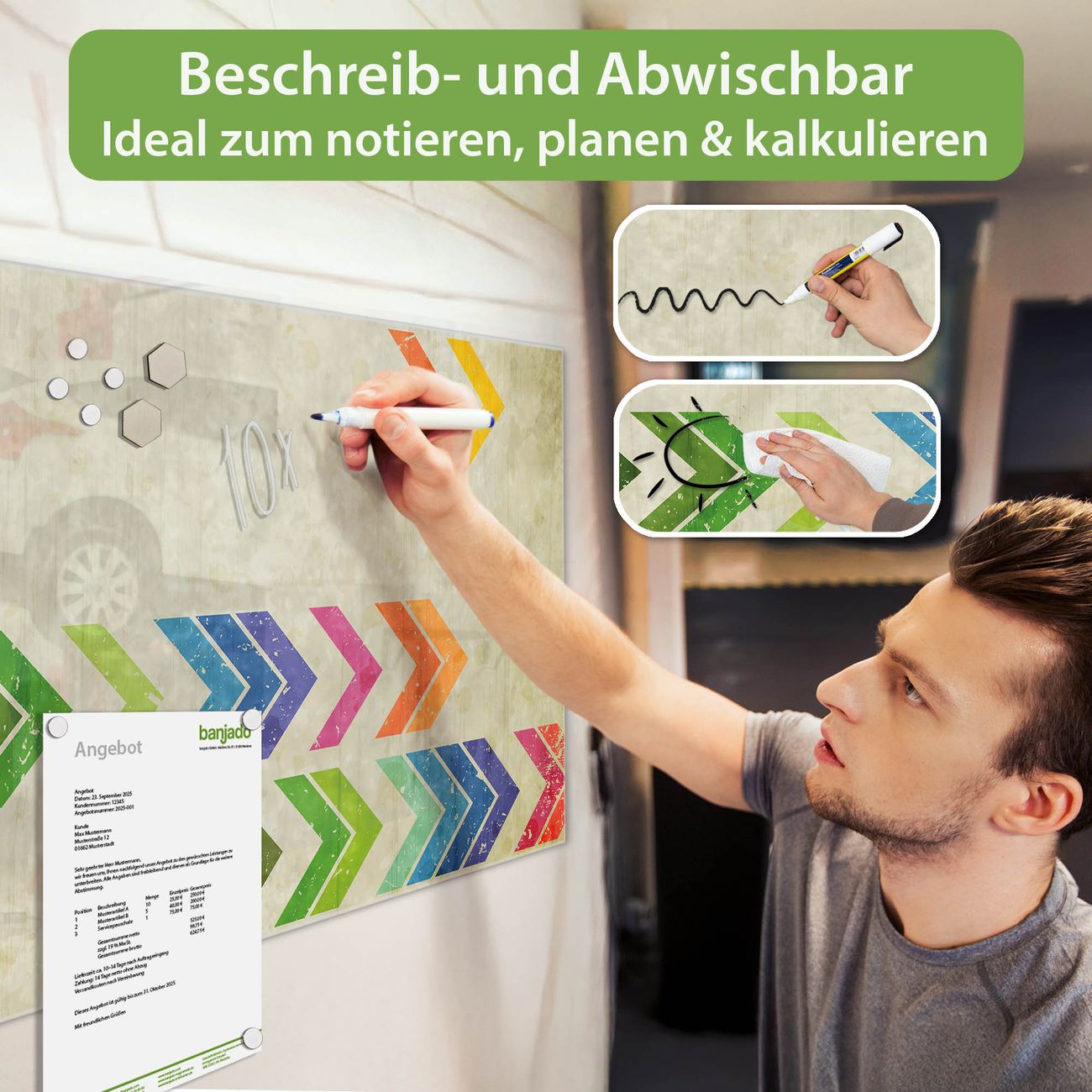 Bitte beachten Sie, dass ausschliessliche spezielle Magnete an der Glastafel haften. Wir empfehlen banjado Neodym Magnete, diese sind durch uns auf Wirksamkeit geprüft.