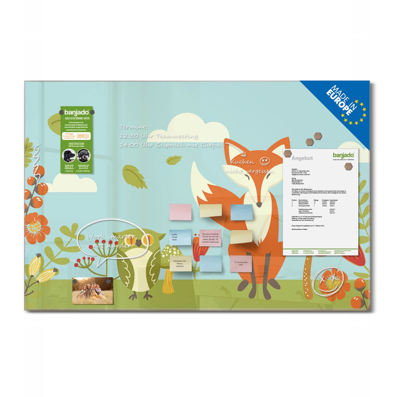 Material: 4mm Sicherheitsglas mit Metallrückwand Eigenschaften: beschreibbar, magnetisch, kratzfest Maße: 120x80x0,6cm, 14,40kg schwer Motiv Nummer 11418 Neulich Im Wald Zubehör: inklusive 4 Neodym-Magnete