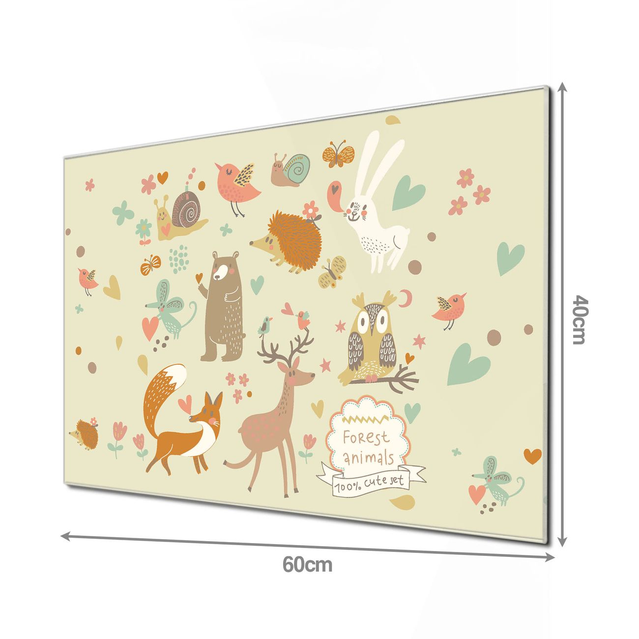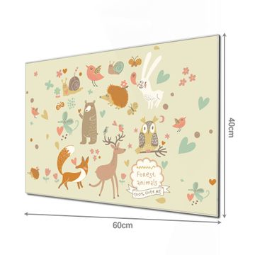 Material: 4mm Sicherheitsglas mit Metallrückwand Eigenschaften: beschreibbar, magnetisch, kratzfest Maße: 60x40x0,6cm, 3,6kg schwer Motiv Nummer 10878 Waldtiere Zubehör: inklusive 4 Neodym-Magnete