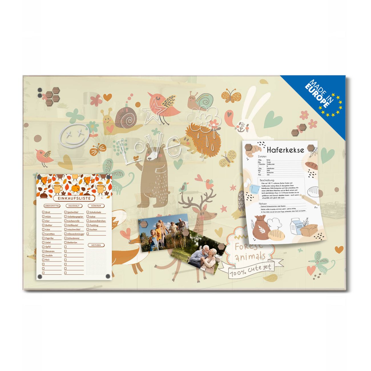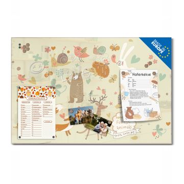 Material: 4mm Sicherheitsglas mit Metallrückwand Eigenschaften: beschreibbar, magnetisch, kratzfest Maße: 75x50x0,6cm, 5,63kg schwer Motiv Nummer 10878 Waldtiere Zubehör: inklusive 4 Neodym-Magnete