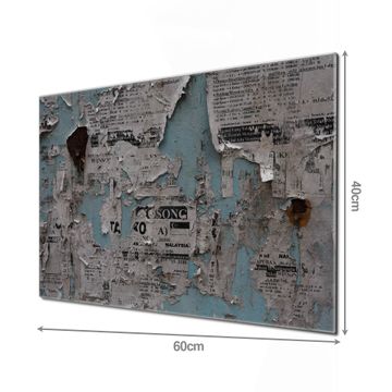 Material  4mm Sicherheitsglas mit Metallrückwand Eigenschaften  beschreibbar, magnetisch, kratzfest Maße  60x40x0,6cm, 3,6kg schwer Motiv  Nummer 10549 Wand mit Zeitungen Zubehör  inklusive 4 Neodym-Magnete