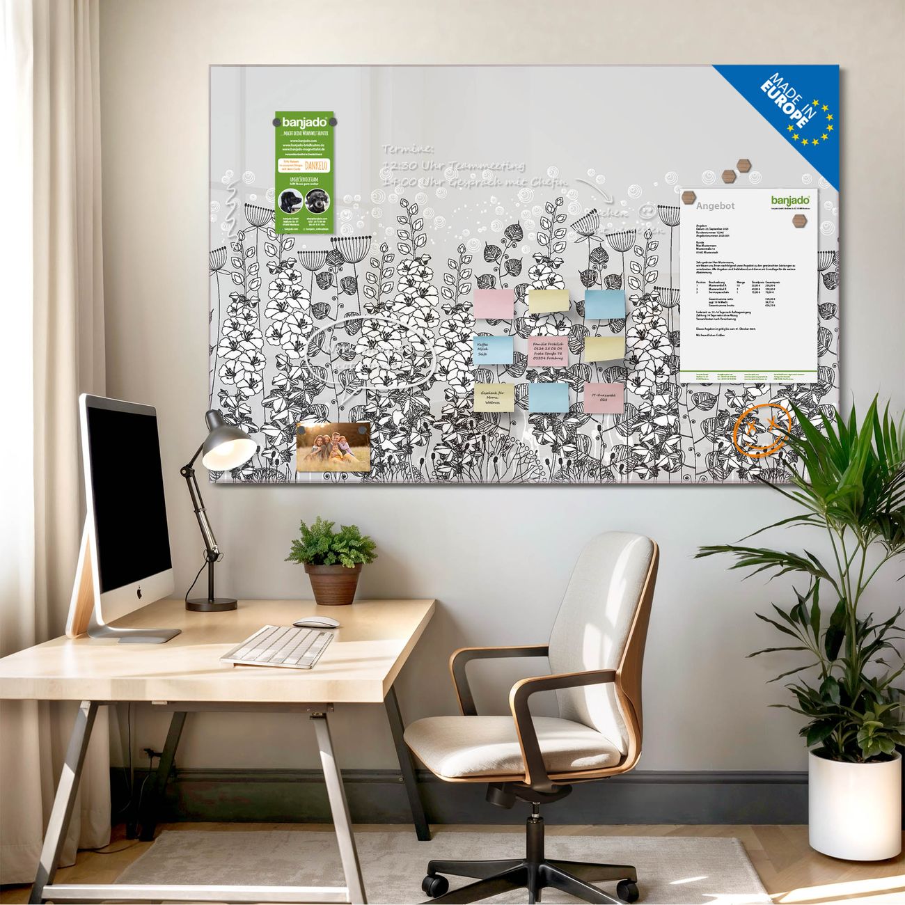 Jede Glas Magnettafel wird in unserer Werkstatt von Hand gefertigt und sorgfältig geprüft. So erhalten Sie ein echtes Qualitätsprodukt, das Funktion und Ästhetik perfekt vereint.?? Warum banjado?