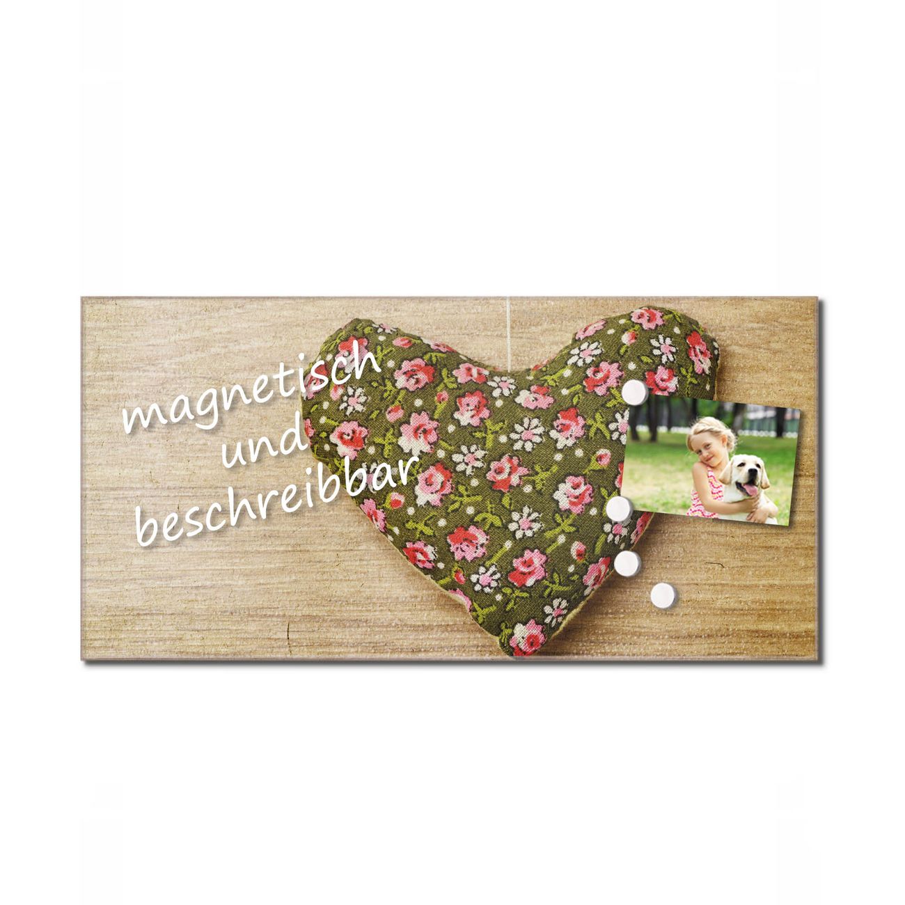 Material: 4mm Sicherheitsglas mit Metallrückwand Eigenschaften: beschreibbar, magnetisch, kratzfest Maße: 120x60x0,6cm, 10,80kg schwer Motiv Nummer 12073 Weiches Herz Zubehör: inklusive 4 Neodym-Magnete
