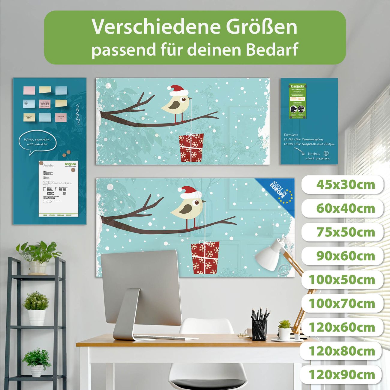 Material: 4mm Sicherheitsglas mit Metallrückwand Eigenschaften: beschreibbar, magnetisch, kratzfest Maße: 100x50x0,6cm, 7,50kg schwer Motiv Nummer 10324 Weihnachten Zubehör: inklusive 4 Neodym-Magnete