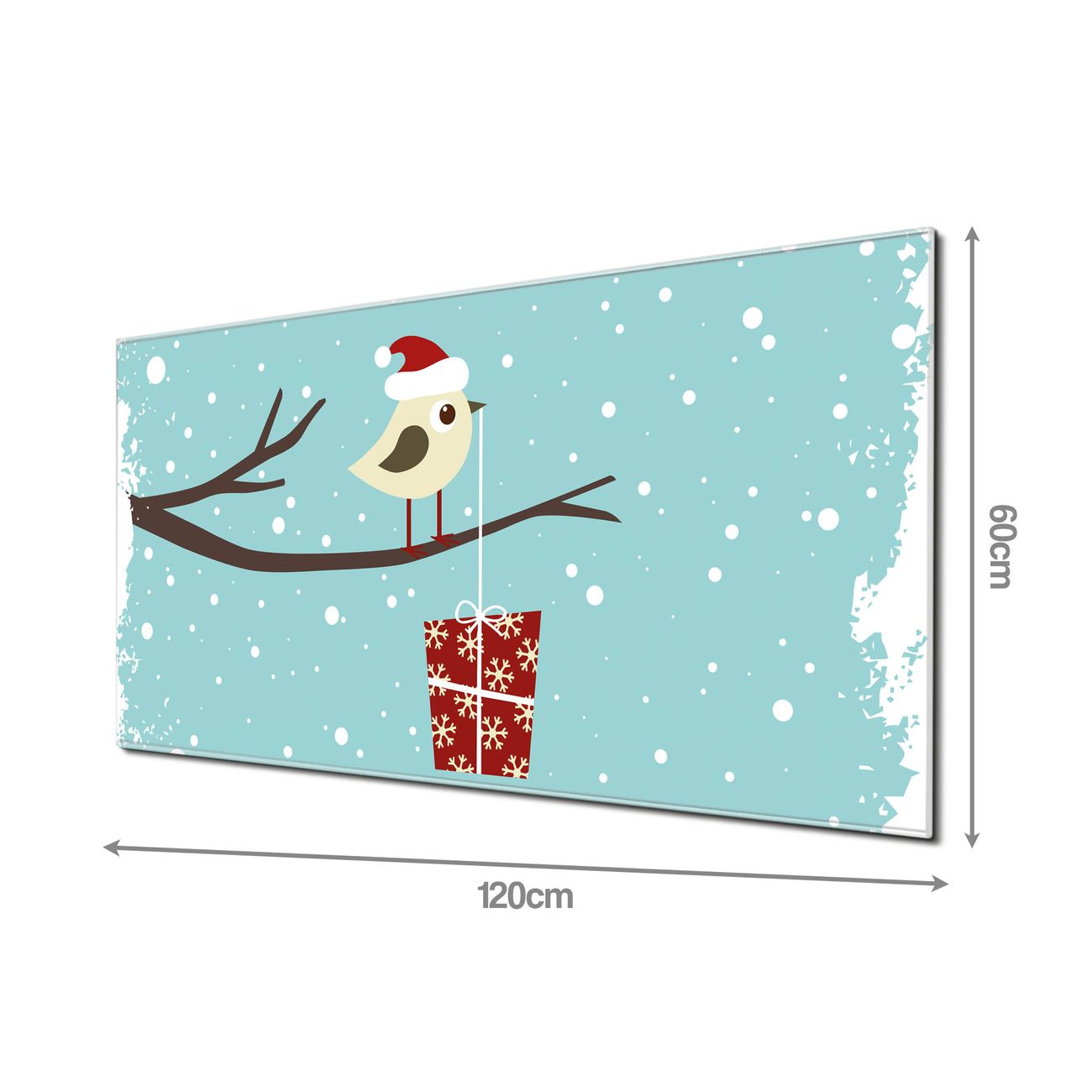 Material: 4mm Sicherheitsglas mit Metallrückwand Eigenschaften: beschreibbar, magnetisch, kratzfest Maße: 120x60x0,6cm, 10,80kg schwer Motiv Nummer 10324 Weihnachten Zubehör: inklusive 4 Neodym-Magnete