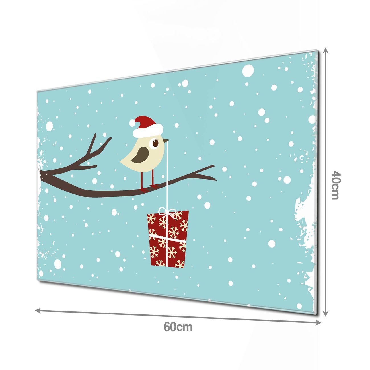 Material: 4mm Sicherheitsglas mit Metallrückwand Eigenschaften: beschreibbar, magnetisch, kratzfest Maße: 60x40x0,6cm, 3,6kg schwer Motiv Nummer 10324 Weihnachten Zubehör: inklusive 4 Neodym-Magnete