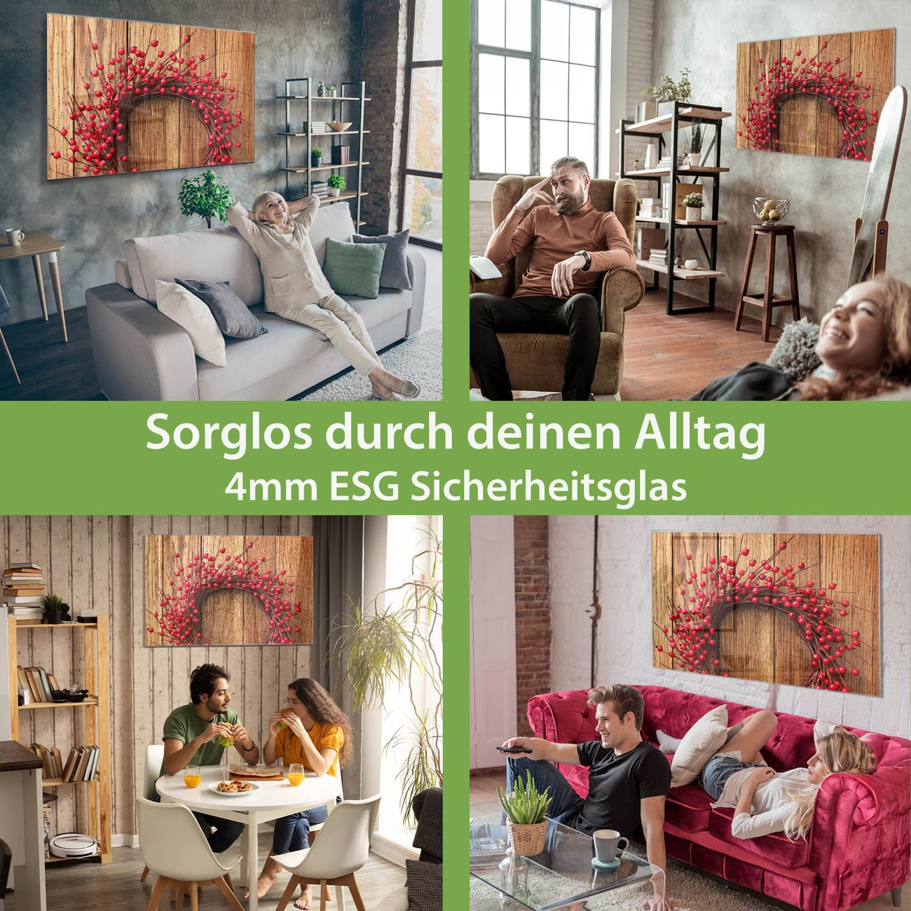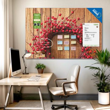 Material: 4mm Sicherheitsglas mit Metallrückwand Eigenschaften: beschreibbar, magnetisch, kratzfest Maße: 120x80x0,6cm, 14,40kg schwer Motiv Nummer 12762 Weihnachtskranz Zubehör: inklusive 4 Neodym-Magnete