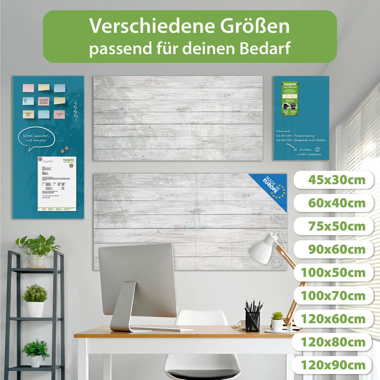 Material: 4mm Sicherheitsglas mit Metallrückwand Eigenschaften: beschreibbar, magnetisch, kratzfest Maße: 100x50x0,6cm, 7,50kg schwer Motiv Nummer 11291 Weiß Gebeizt Zubehör: inklusive 4 Neodym-Magnete