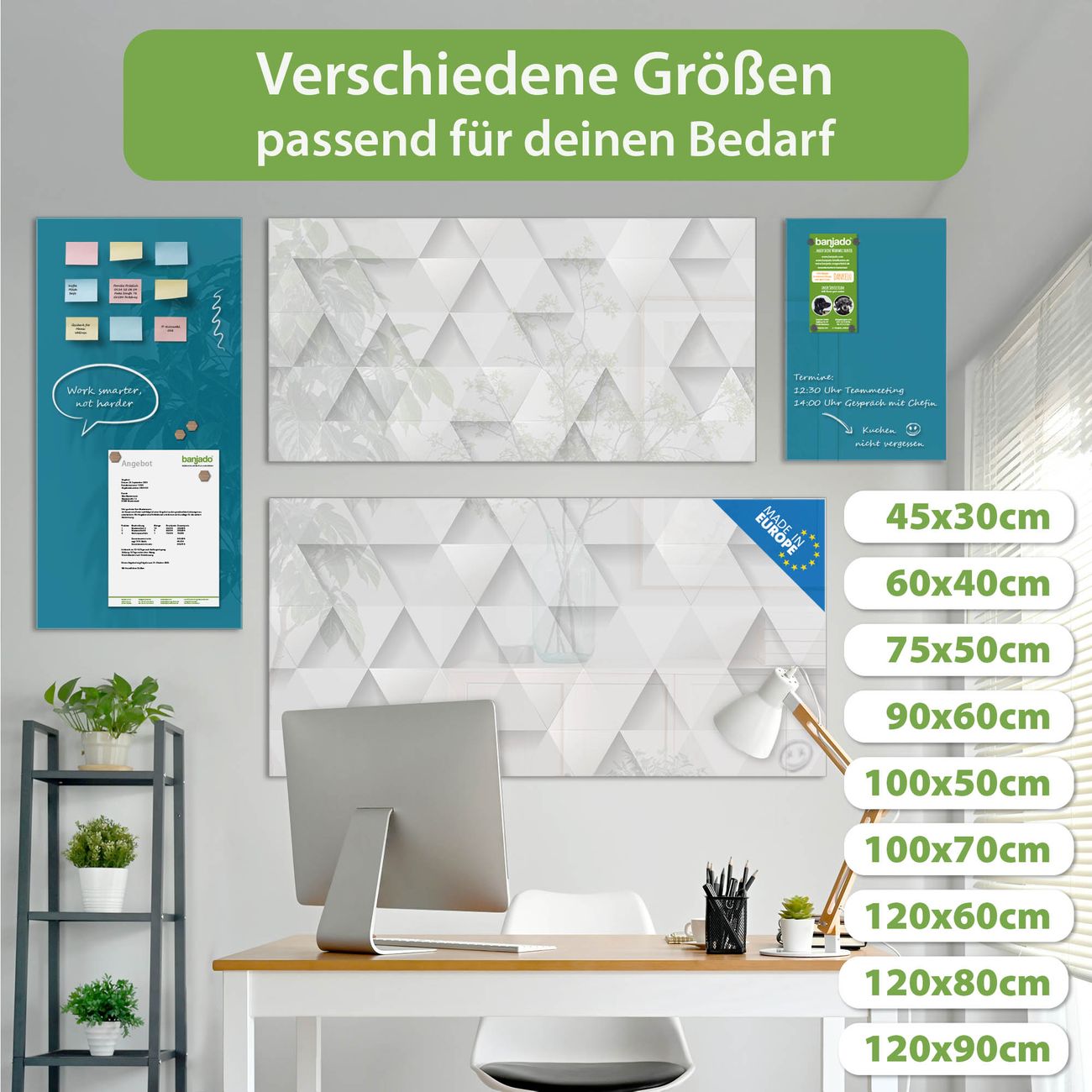 Material: 4mm Sicherheitsglas mit Metallrückwand Eigenschaften: beschreibbar, magnetisch, kratzfest Maße: 100x50x0,6cm, 7,50kg schwer Motiv Nummer 12495 Weisse Dreiecke Zubehör: inklusive 4 Neodym-Magnete
