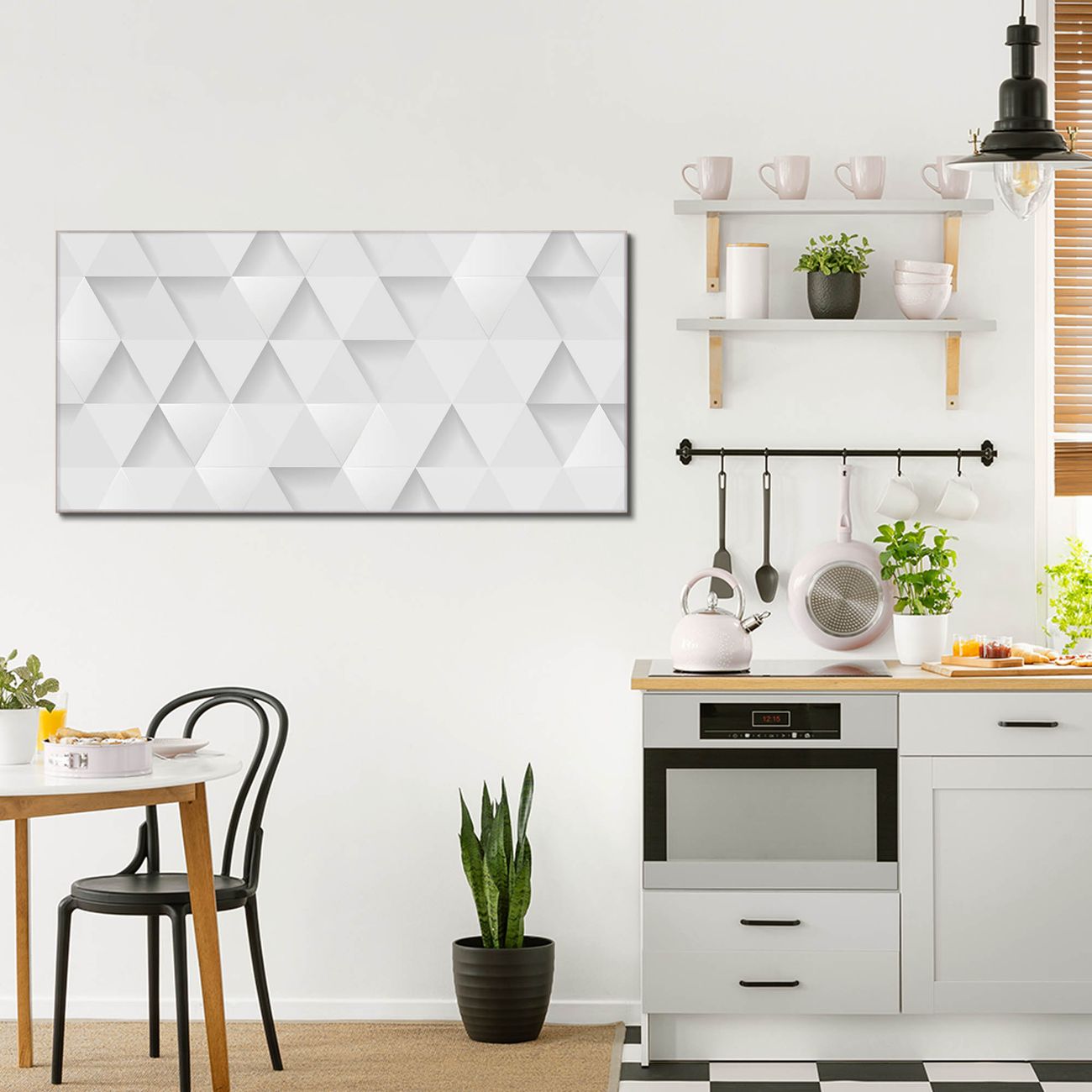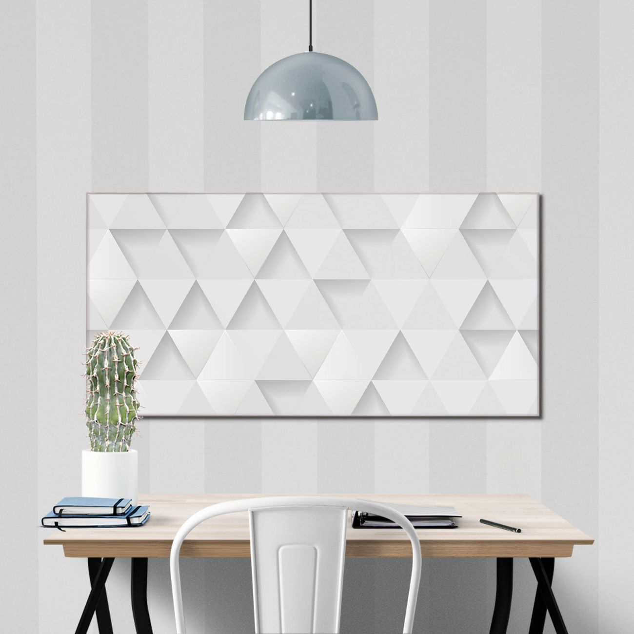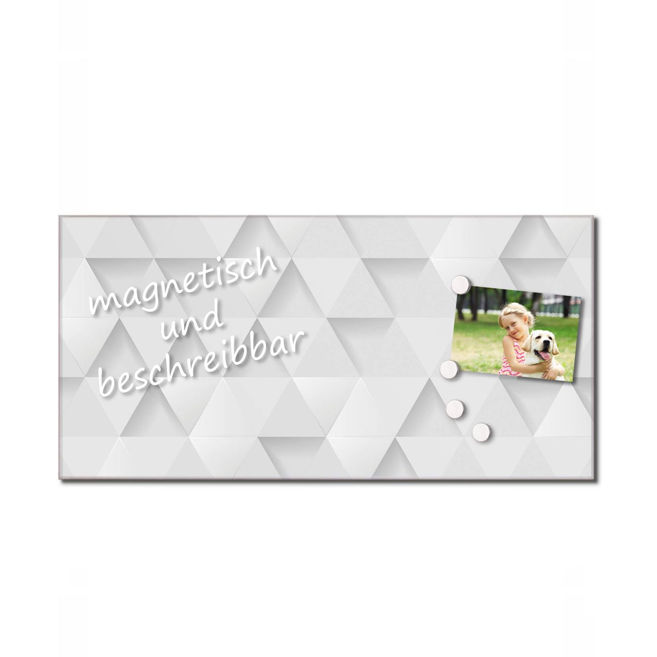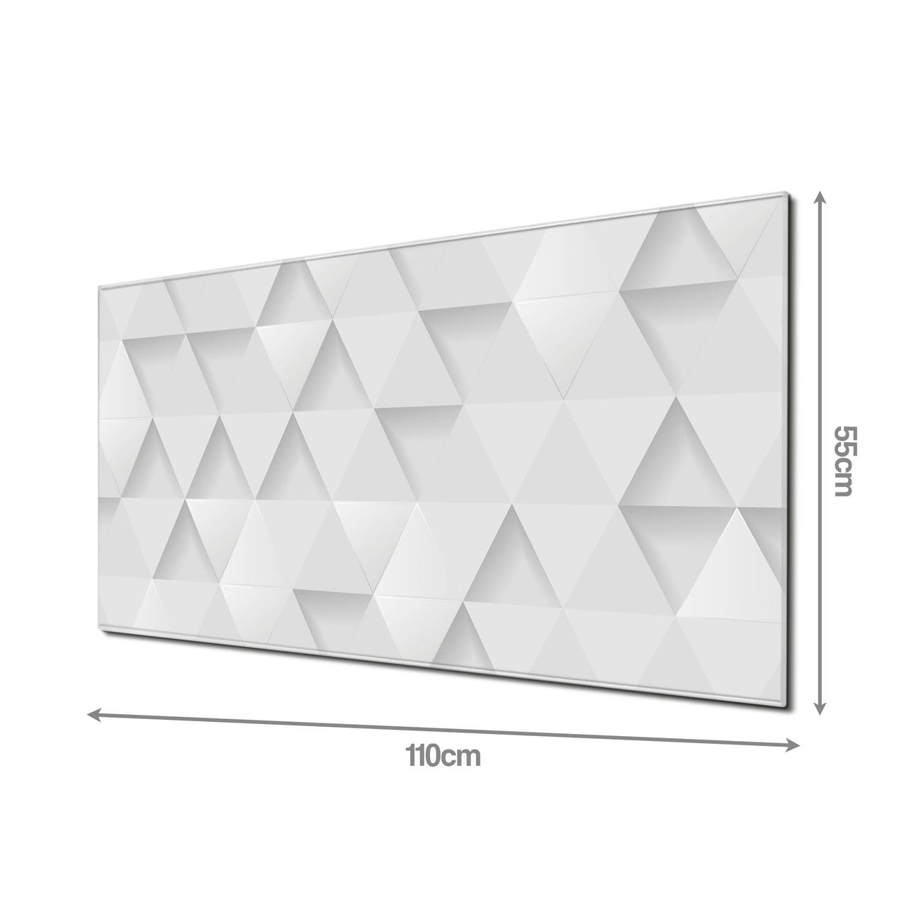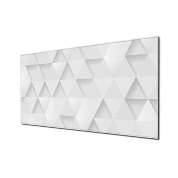 Material: 4mm Sicherheitsglas mit Metallrückwand Eigenschaften: beschreibbar, magnetisch, kratzfest Maße: 110x55x0,6cm, 9,08kg schwer Motiv Nummer 12495 Weisse Dreiecke Zubehör: inklusive 4 Neodym-Magnete