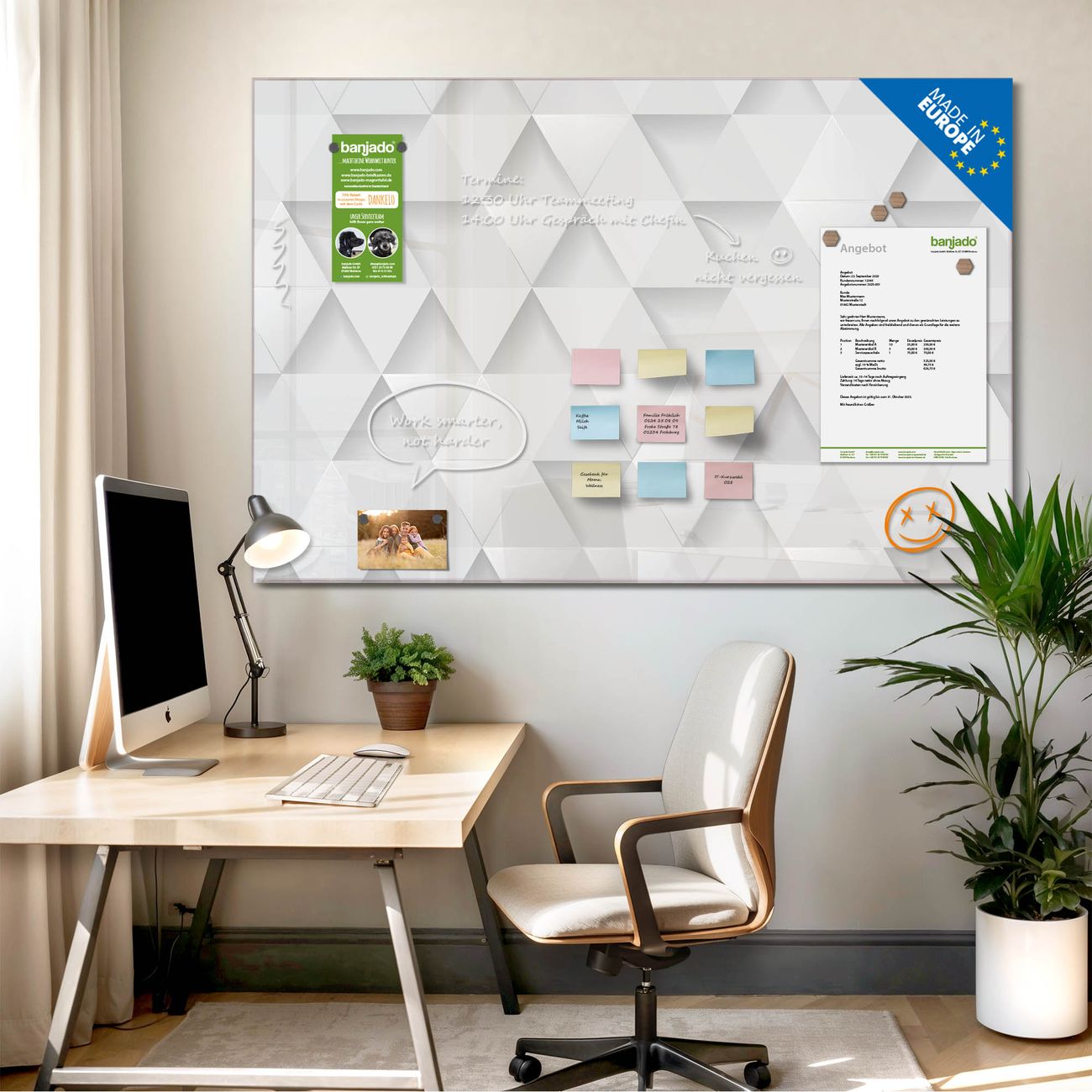 Jede Glas Magnettafel wird in unserer Werkstatt von Hand gefertigt und sorgfältig geprüft. So erhalten Sie ein echtes Qualitätsprodukt, das Funktion und Ästhetik perfekt vereint.?? Warum banjado?