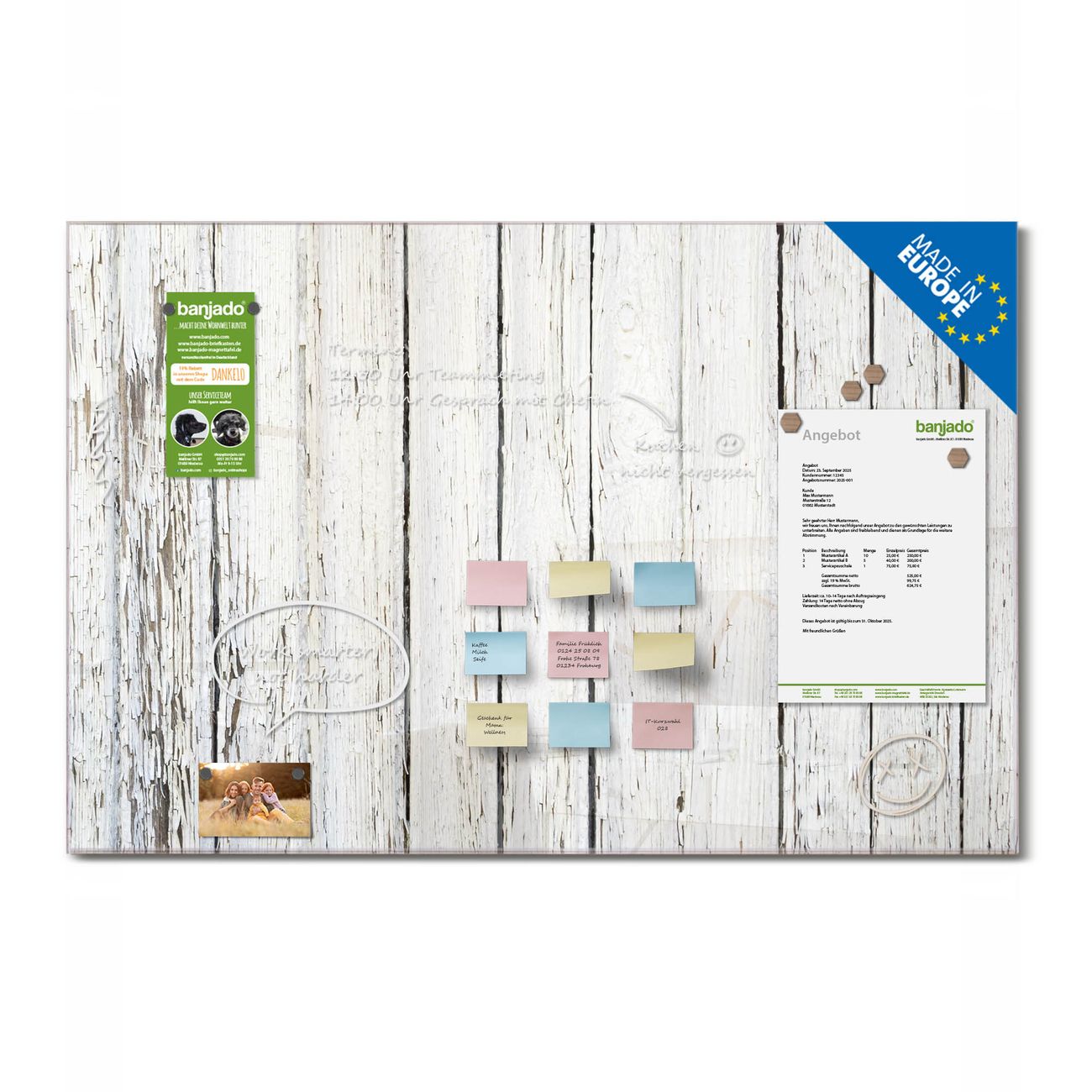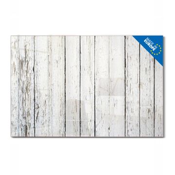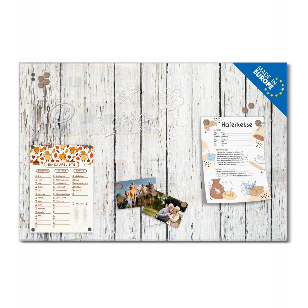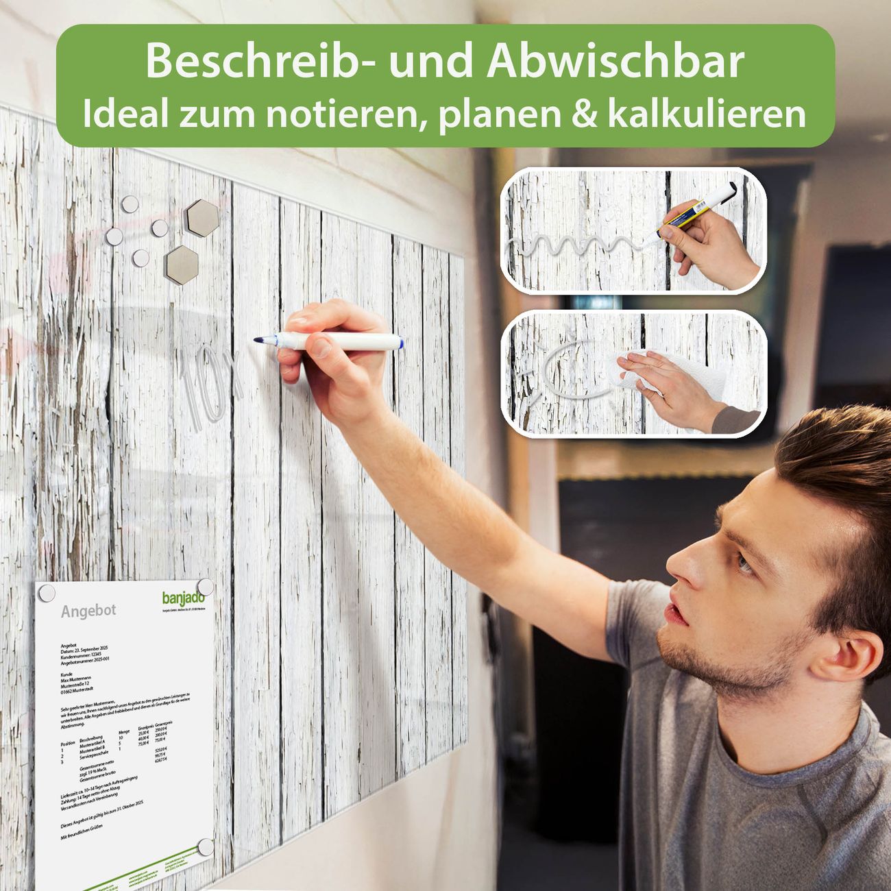 Material: 4mm Sicherheitsglas mit Metallrückwand Eigenschaften: beschreibbar, magnetisch, kratzfest Maße: 120x60x0,6cm, 10,80kg schwer Motiv Nummer 10442 Weißer Bretterzaun Zubehör: inklusive 4 Neodym-Magnete