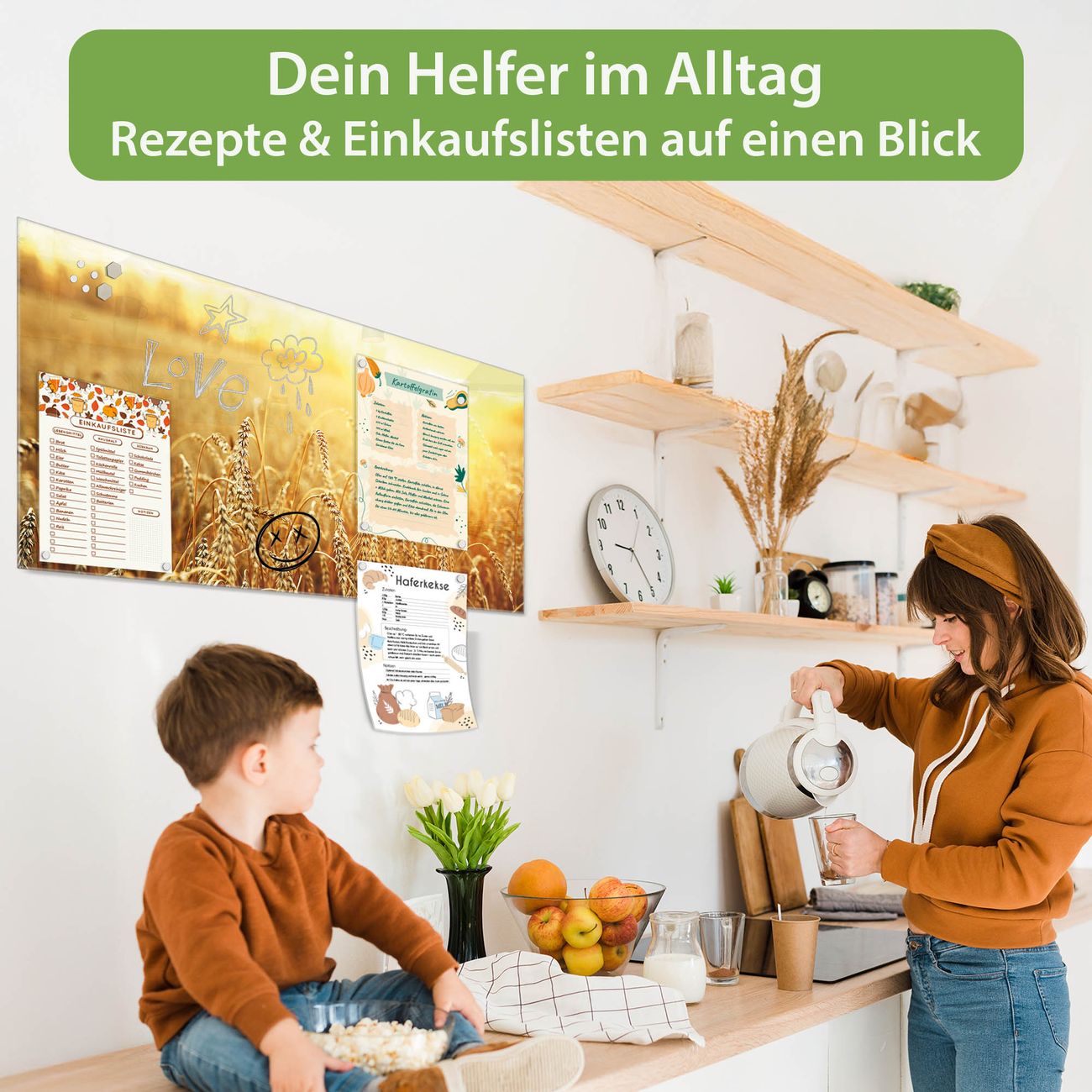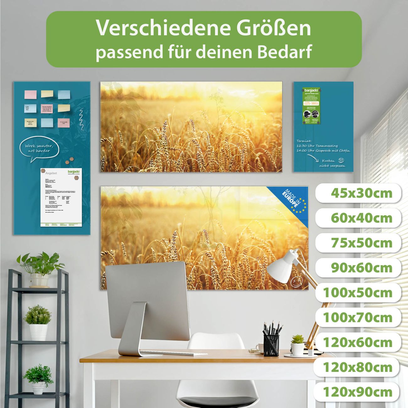Material: 4mm Sicherheitsglas mit Metallrückwand Eigenschaften: beschreibbar, magnetisch, kratzfest Maße: 100x50x0,6cm, 7,50kg schwer Motiv Nummer 12537 Weizenfeld Zubehör: inklusive 4 Neodym-Magnete
