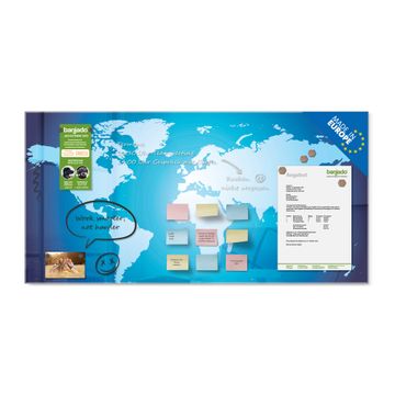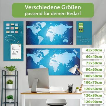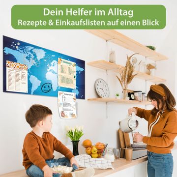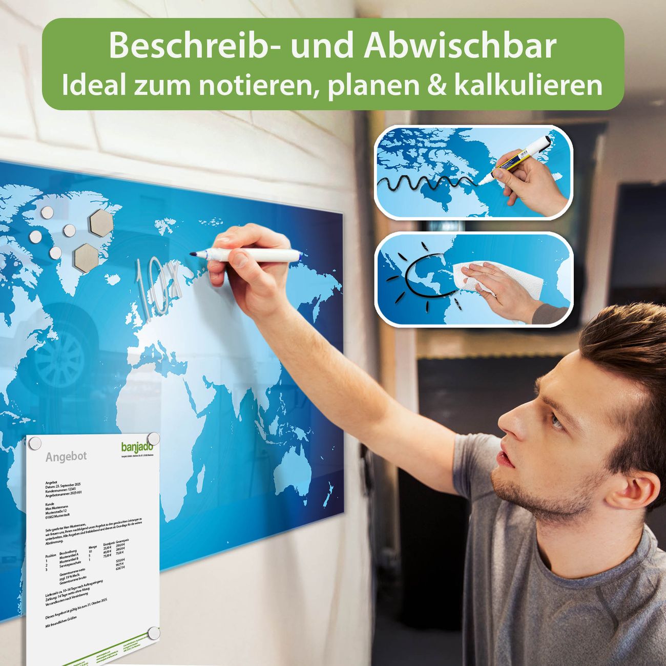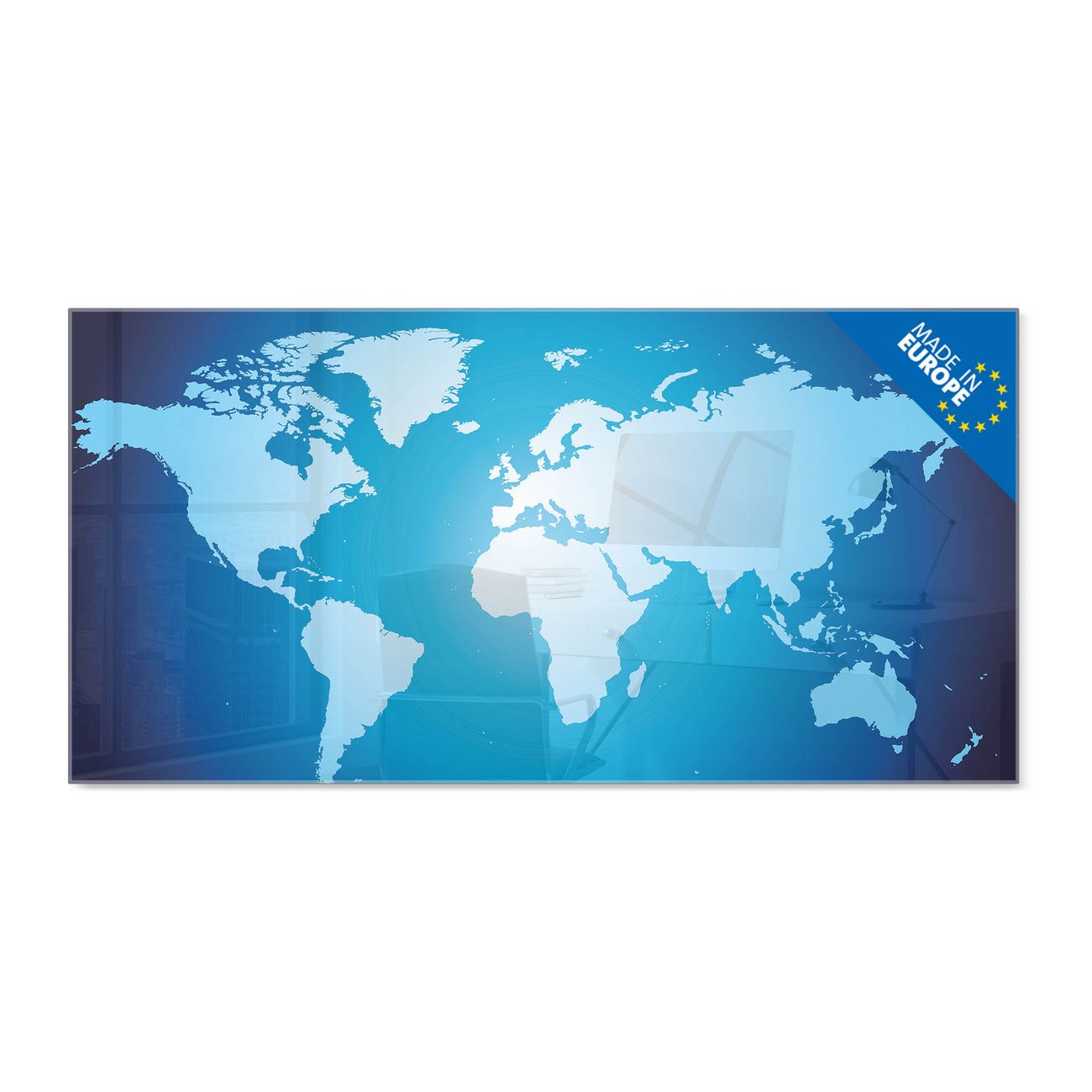 Material: 4mm Sicherheitsglas mit Metallrückwand Eigenschaften: beschreibbar, magnetisch, kratzfest Maße: 120x60x0,6cm, 10,80kg schwer Motiv Nummer 10196 Weltkarte Zubehör: inklusive 4 Neodym-Magnete