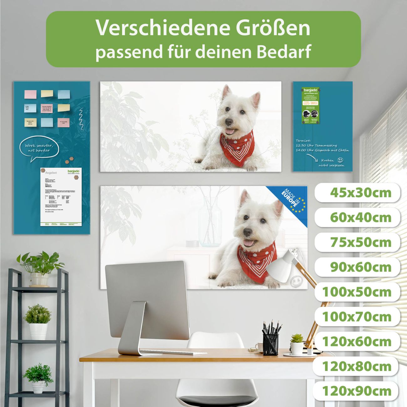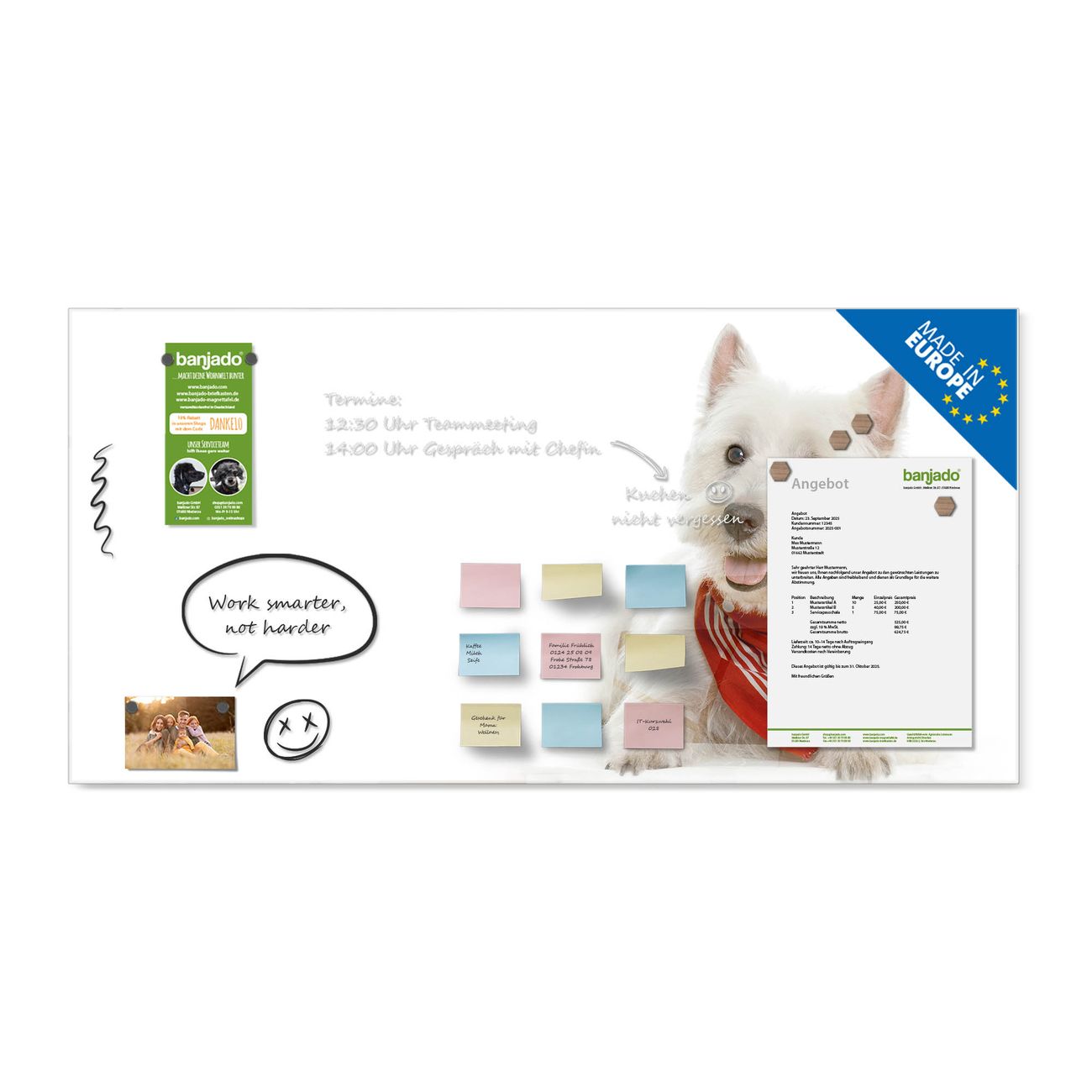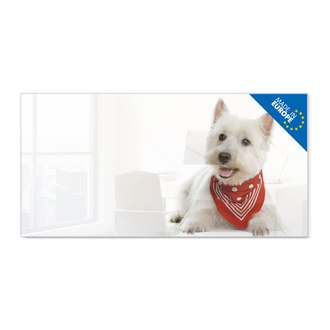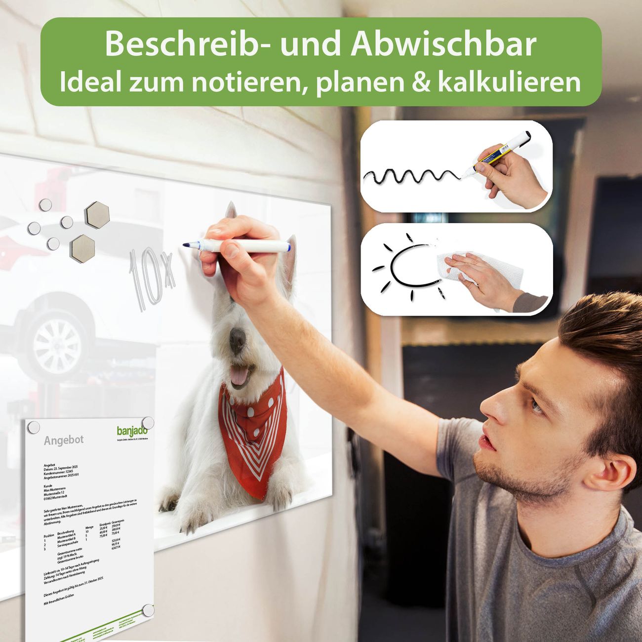 Material: 4mm Sicherheitsglas mit Metallrückwand Eigenschaften: beschreibbar, magnetisch, kratzfest Maße: 100x50x0,6cm, 7,50kg schwer Motiv Nummer 10192 Westie Zubehör: inklusive 4 Neodym-Magnete