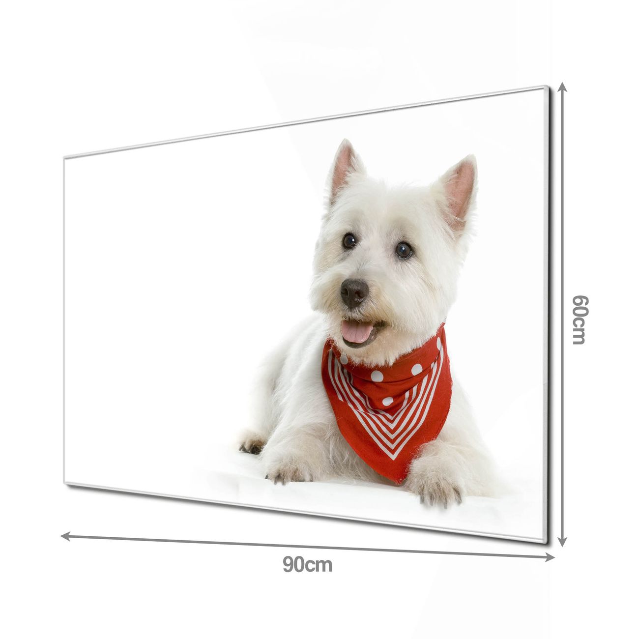 Material: 4mm Sicherheitsglas mit Metallrückwand Eigenschaften: beschreibbar, magnetisch, kratzfest Maße: 90x60x0,6cm, 8,10kg schwer Motiv Nummer 10192 Westie Zubehör: inklusive 4 Neodym-Magnete