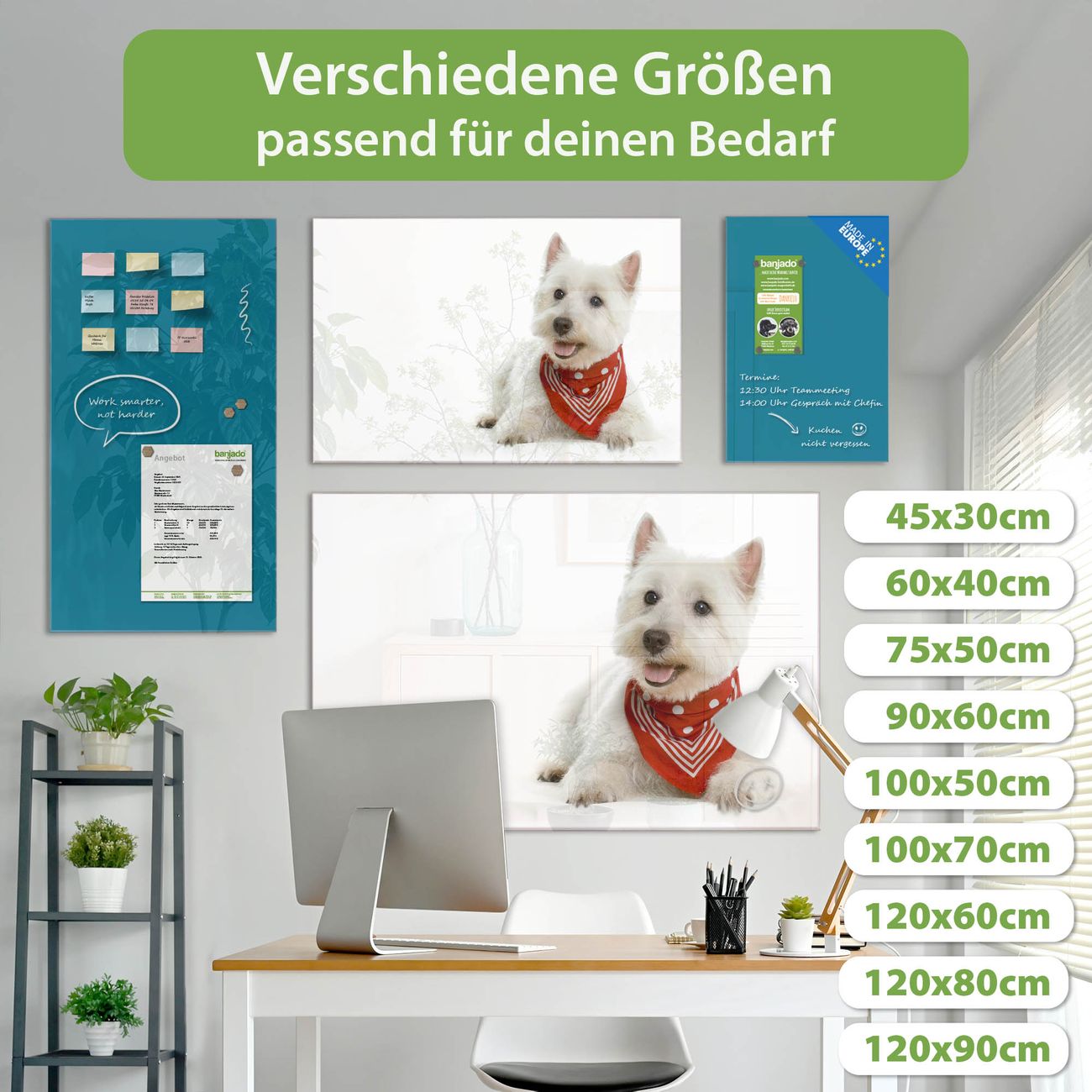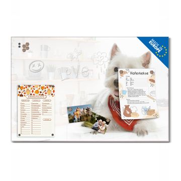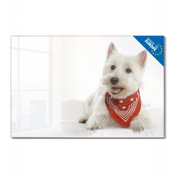 Material: 4mm Sicherheitsglas mit Metallrückwand Eigenschaften: beschreibbar, magnetisch, kratzfest Maße: 45x30x0,6cm, 2,03kg schwer Motiv Nummer 10192 Westie Zubehör: inklusive 4 Neodym-Magnete
