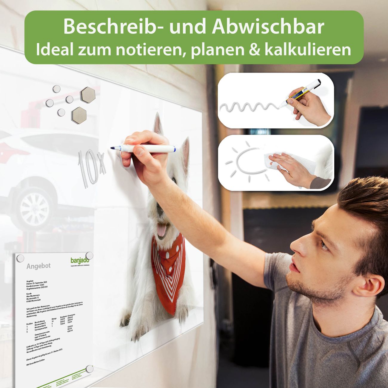 Bitte beachten Sie, dass ausschliessliche spezielle Magnete an der Glastafel haften. Wir empfehlen banjado Neodym Magnete, diese sind durch uns auf Wirksamkeit geprüft.