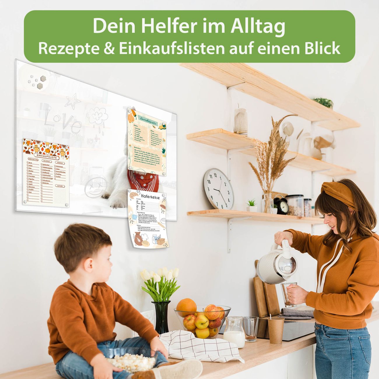 Auf der glatten Glasoberfläche lassen sich Termine, Rezepte oder Notizen ganz einfach mit Kreidestiften festhalten und rückstandslos entfernen. Starke Neodym-Magnete halten Ihre wichtigsten Erinnerungen sicher an Ort und Stelle. So entsteht Ihre ganz persönliche Ideenwand - jeden Tag neu.