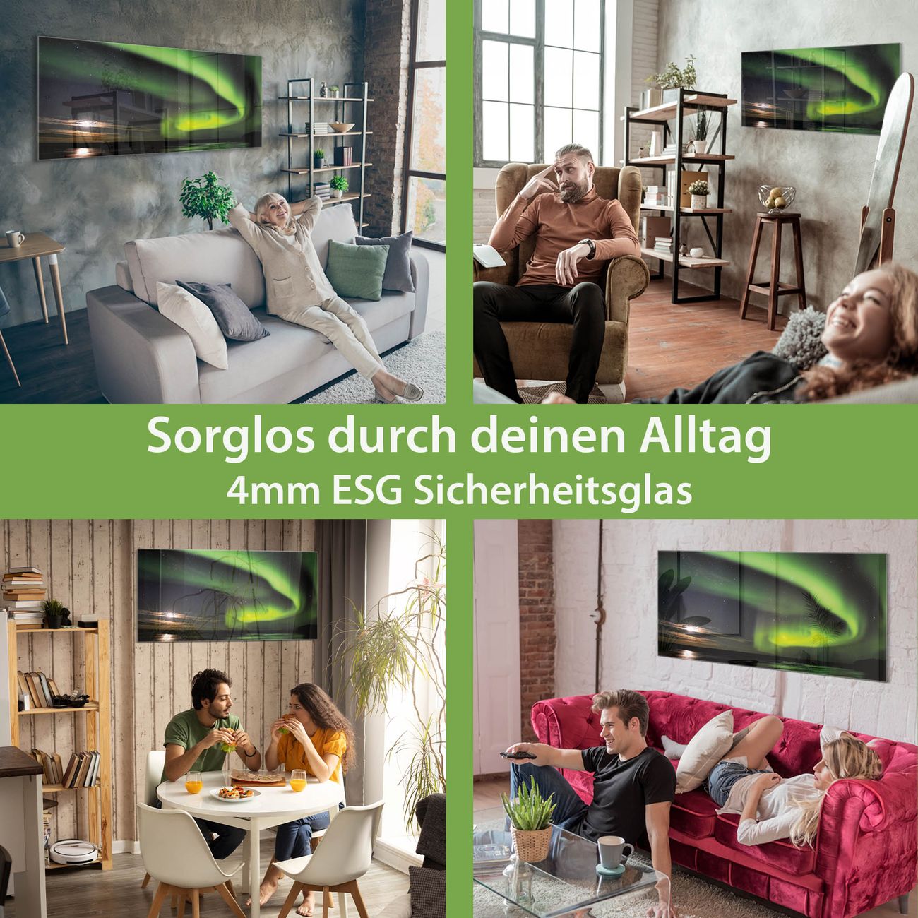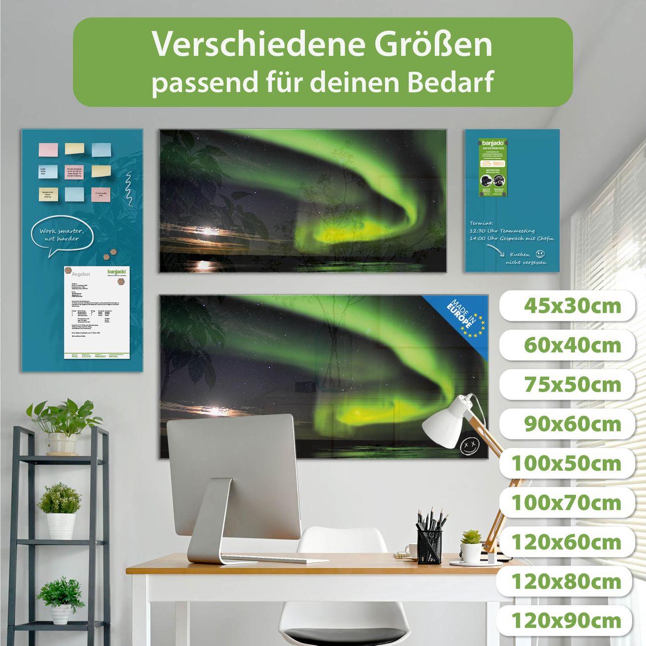Material: 4mm Sicherheitsglas mit Metallrückwand Eigenschaften: beschreibbar, magnetisch, kratzfest Maße: 100x50x0,6cm, 7,50kg schwer Motiv Nummer 10236 Wetterleuchten Zubehör: inklusive 4 Neodym-Magnete