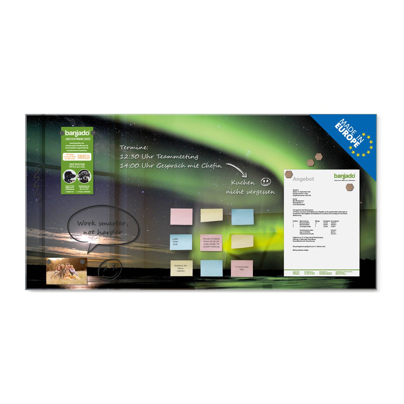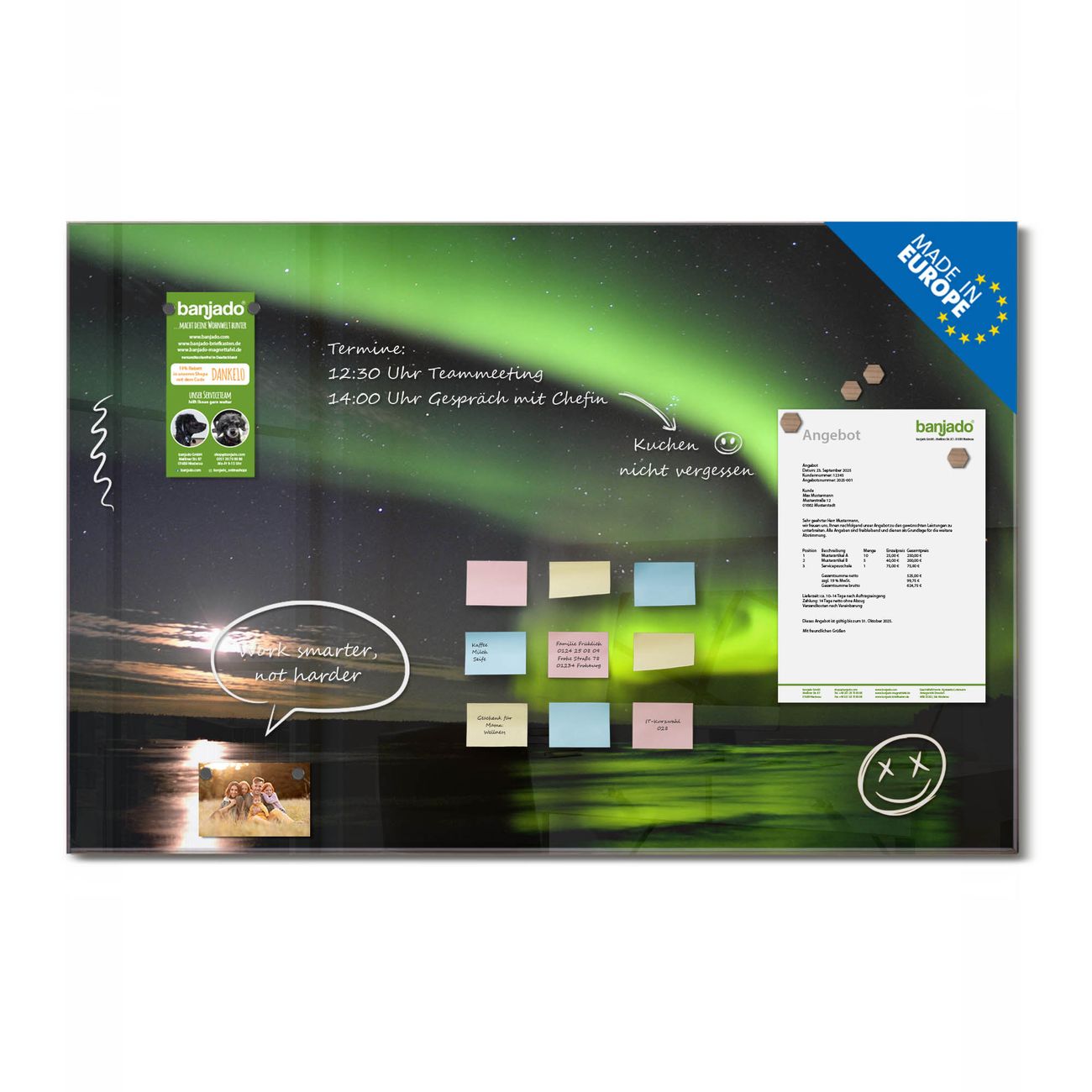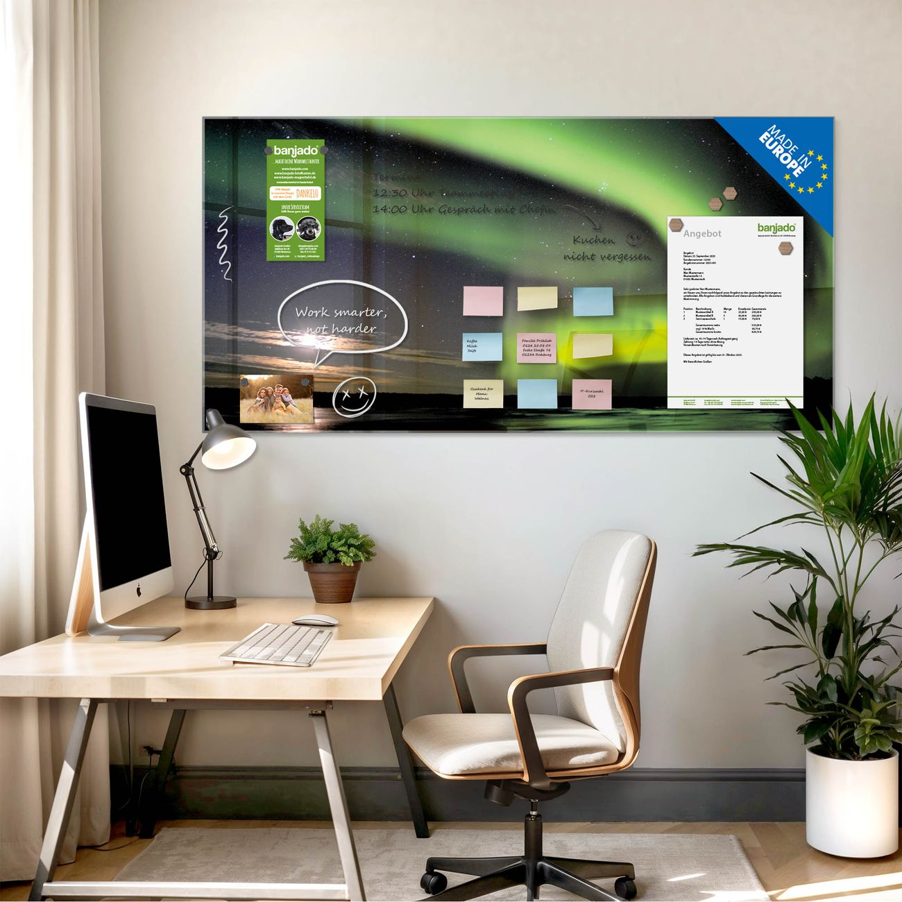 Jede Glas Magnettafel wird in unserer Werkstatt von Hand gefertigt und sorgfältig geprüft. So erhalten Sie ein echtes Qualitätsprodukt, das Funktion und Ästhetik perfekt vereint.