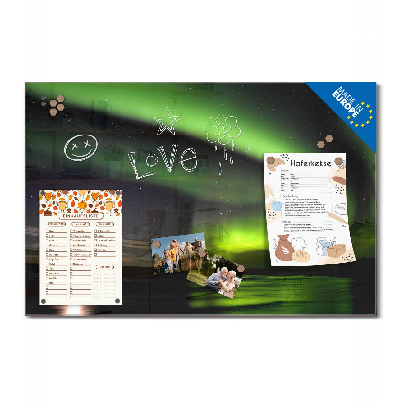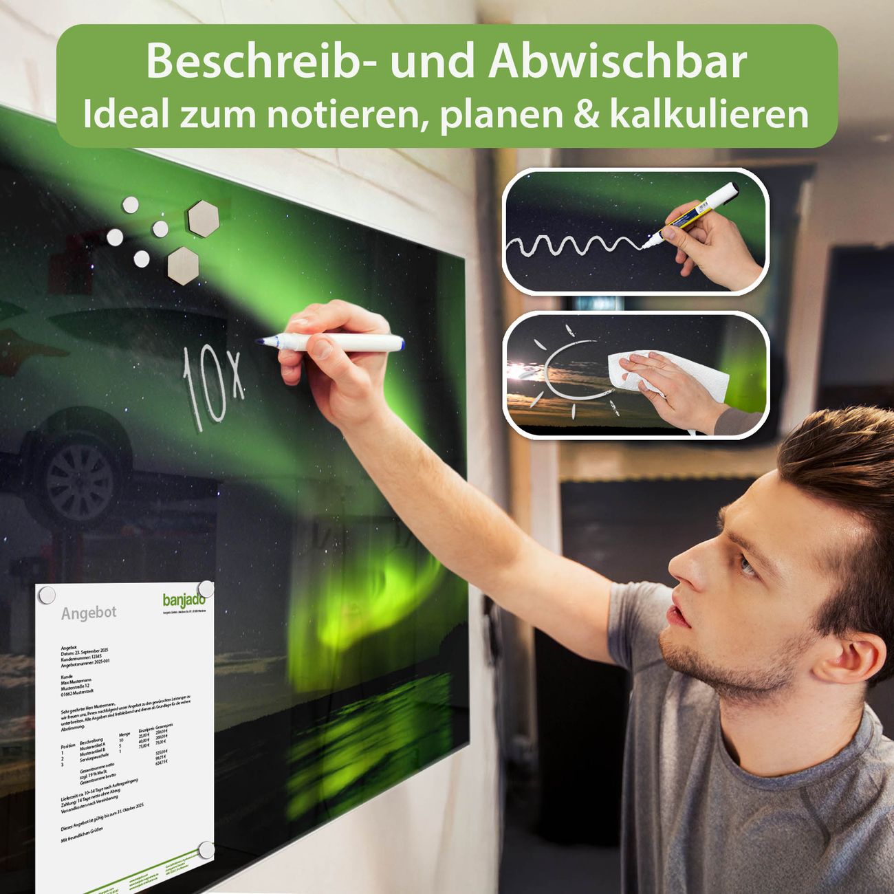 Auf der glatten Glasoberfläche lassen sich Termine, Rezepte oder Notizen ganz einfach mit Kreidestiften festhalten und rückstandslos entfernen. Starke Neodym-Magnete halten Ihre wichtigsten Erinnerungen sicher an Ort und Stelle. So entsteht Ihre ganz persönliche Ideenwand - jeden Tag neu.