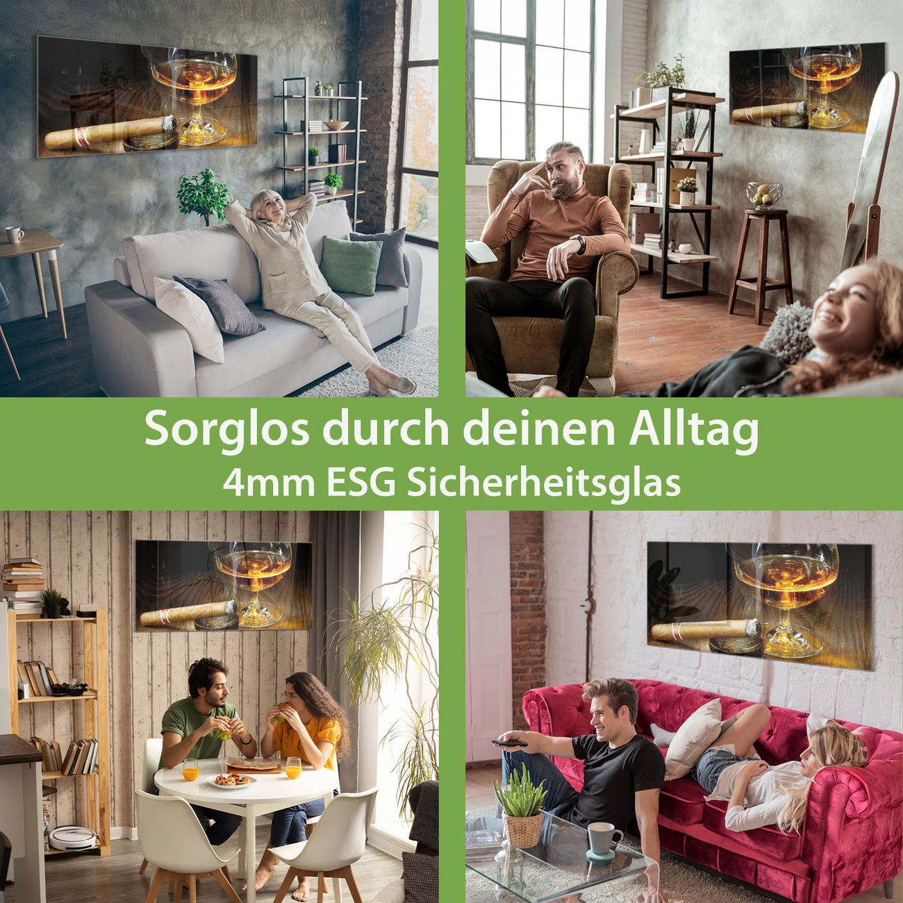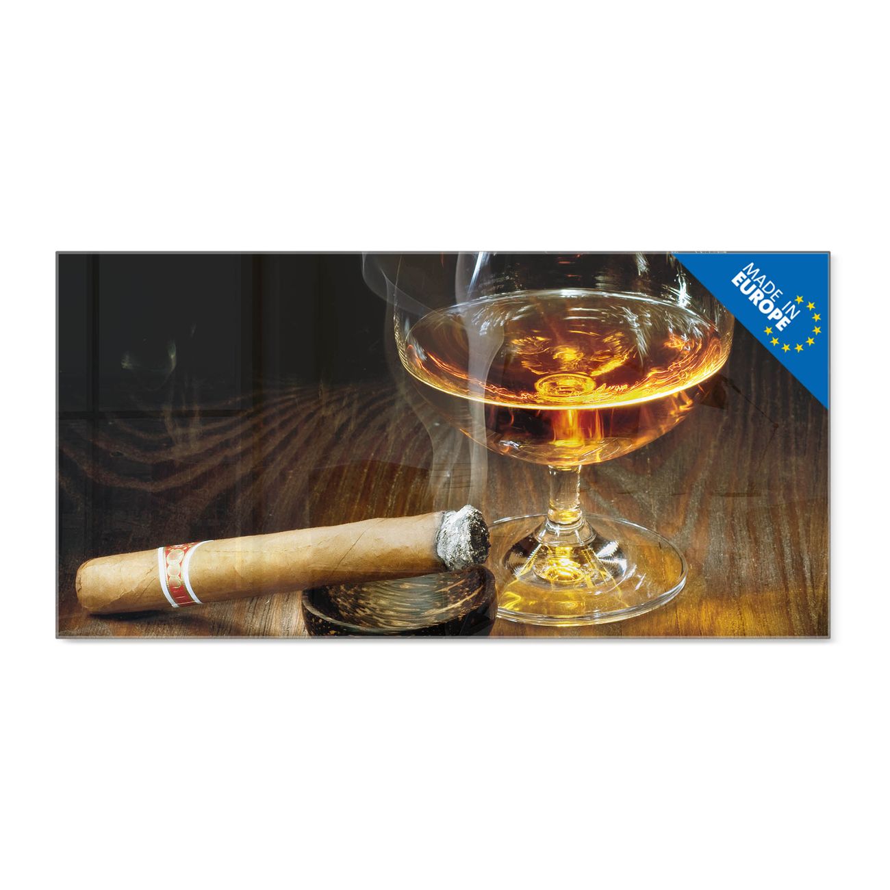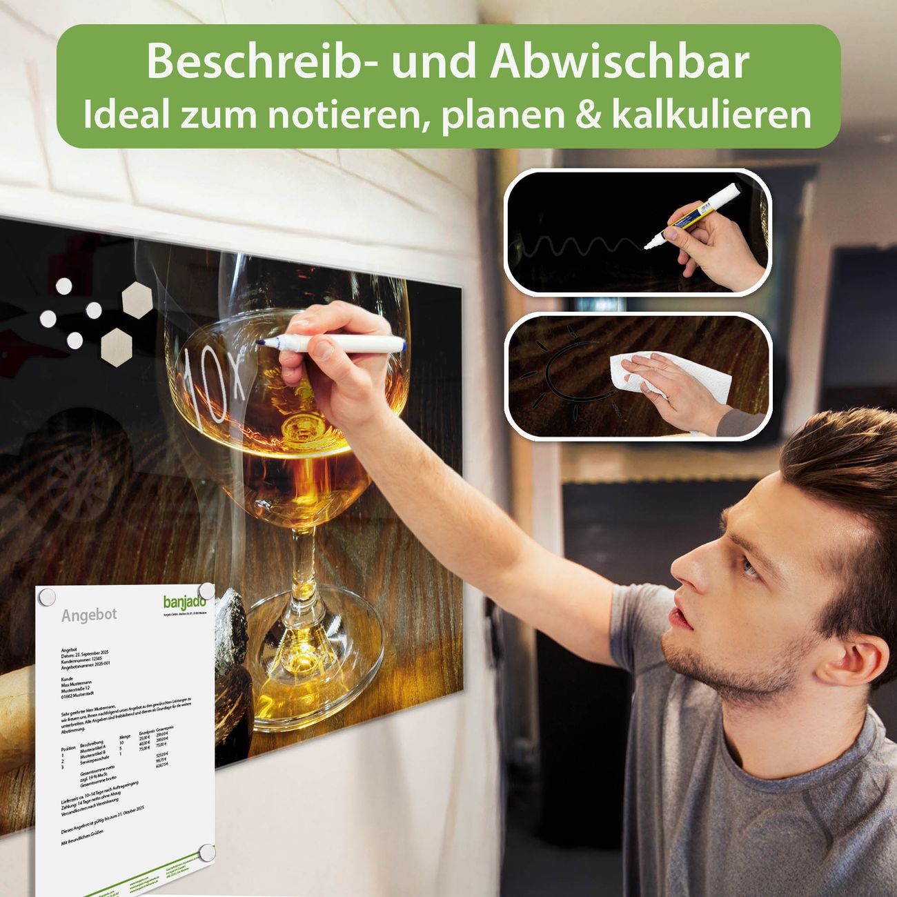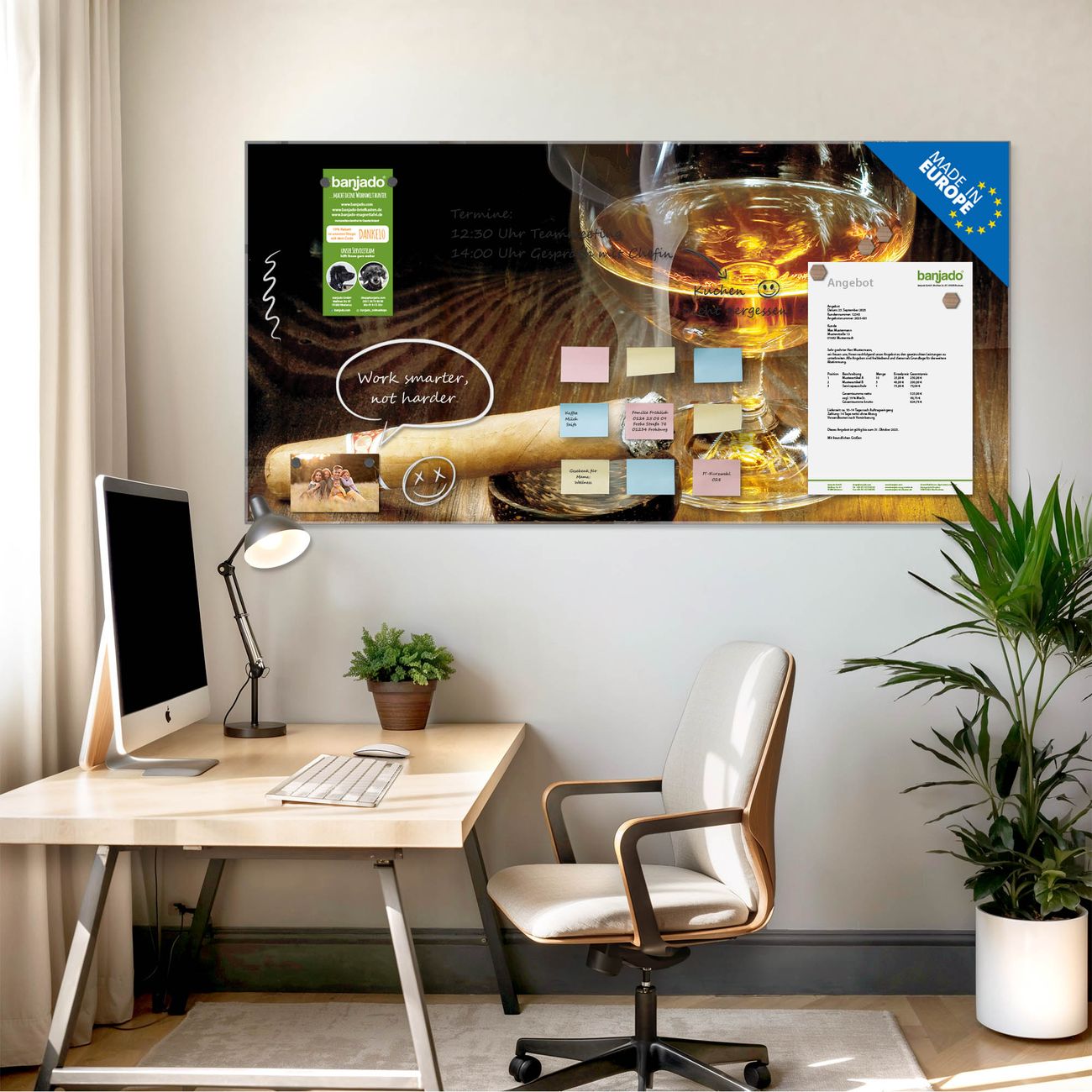 Material: 4mm Sicherheitsglas mit Metallrückwand Eigenschaften: beschreibbar, magnetisch, kratzfest Maße: 100x50x0,6cm, 7,50kg schwer Motiv Nummer 10163 Whiskey & Cigar Zubehör: inklusive 4 Neodym-Magnete