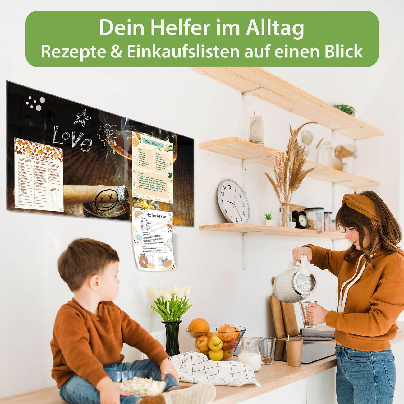 Ein Stück Design, das Ihren Alltag organisiert. Schreiben, heften, inspirieren - alles an einem Ort. Qualität, die man spürt. Montage leicht gemacht. Handwerk mit Herz - veredelt in Sachsen. Einzigartiges Design mit Motiv Motiv Whiskey & Cigar Beschreibbare Glasoberfläche, leicht zu reinigen Starke Magnetkraft durch Stahlrückwand Inklusive 4 Neodym-Magneten Flexible Montageoptionen Handveredelt in Sachsen - Qualität, die bleibt