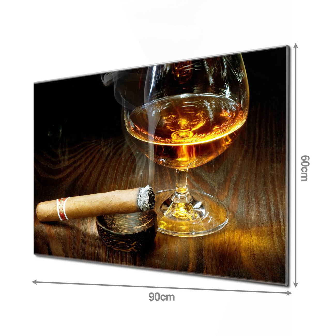 Material: 4mm Sicherheitsglas mit Metallrückwand Eigenschaften: beschreibbar, magnetisch, kratzfest Maße: 90x60x0,6cm, 8,10kg schwer Motiv Nummer 10163 Whiskey & Cigar Zubehör: inklusive 4 Neodym-Magnete
