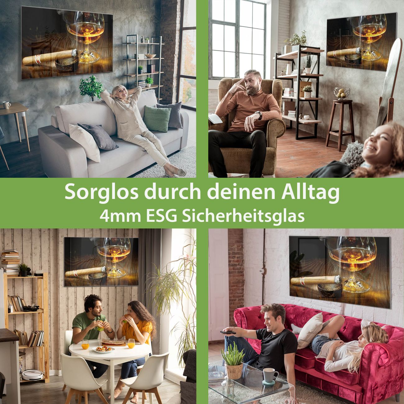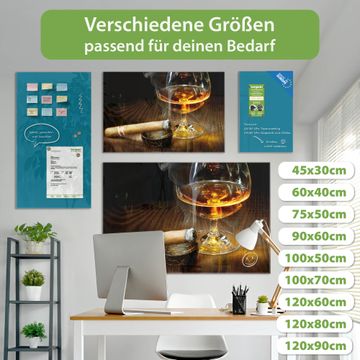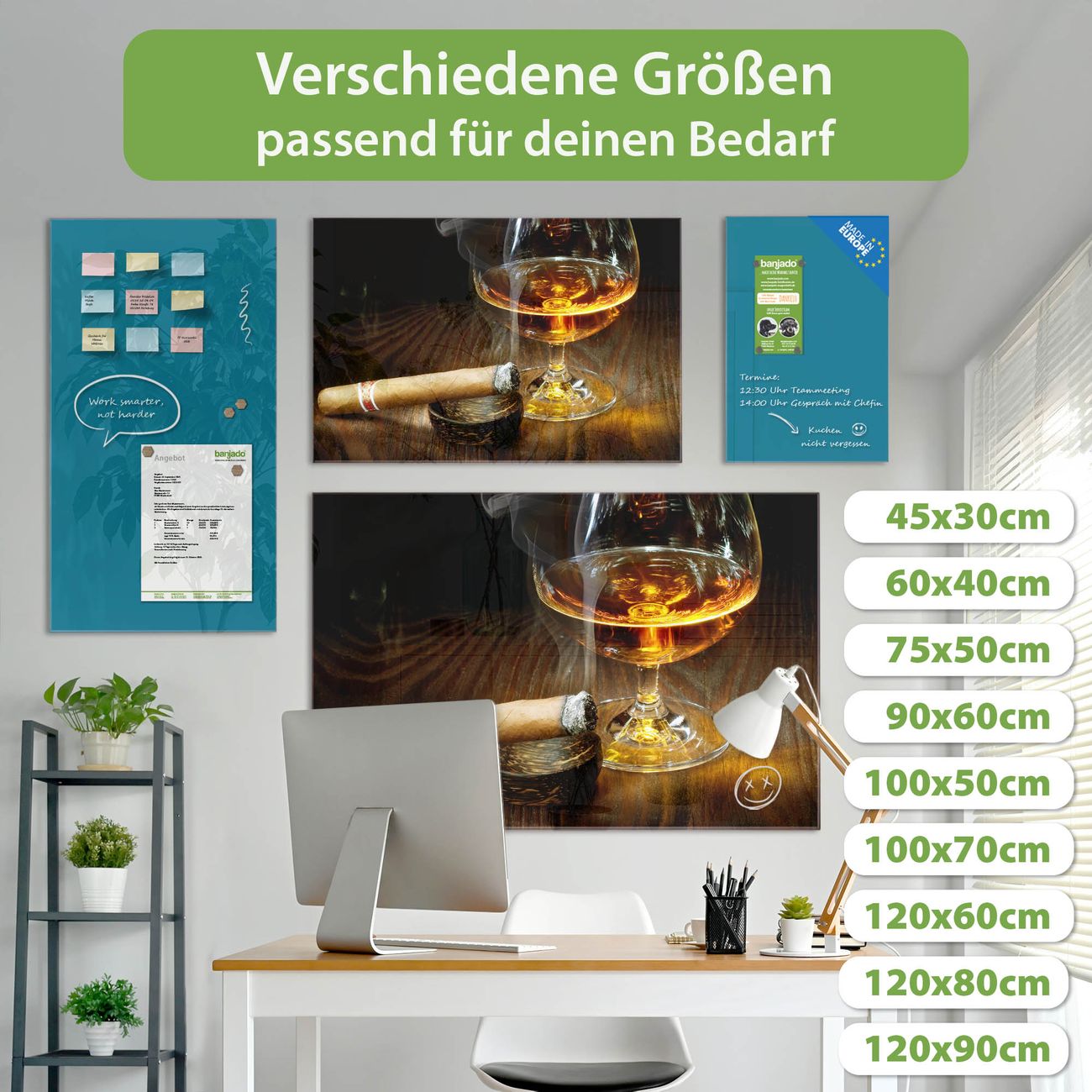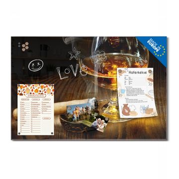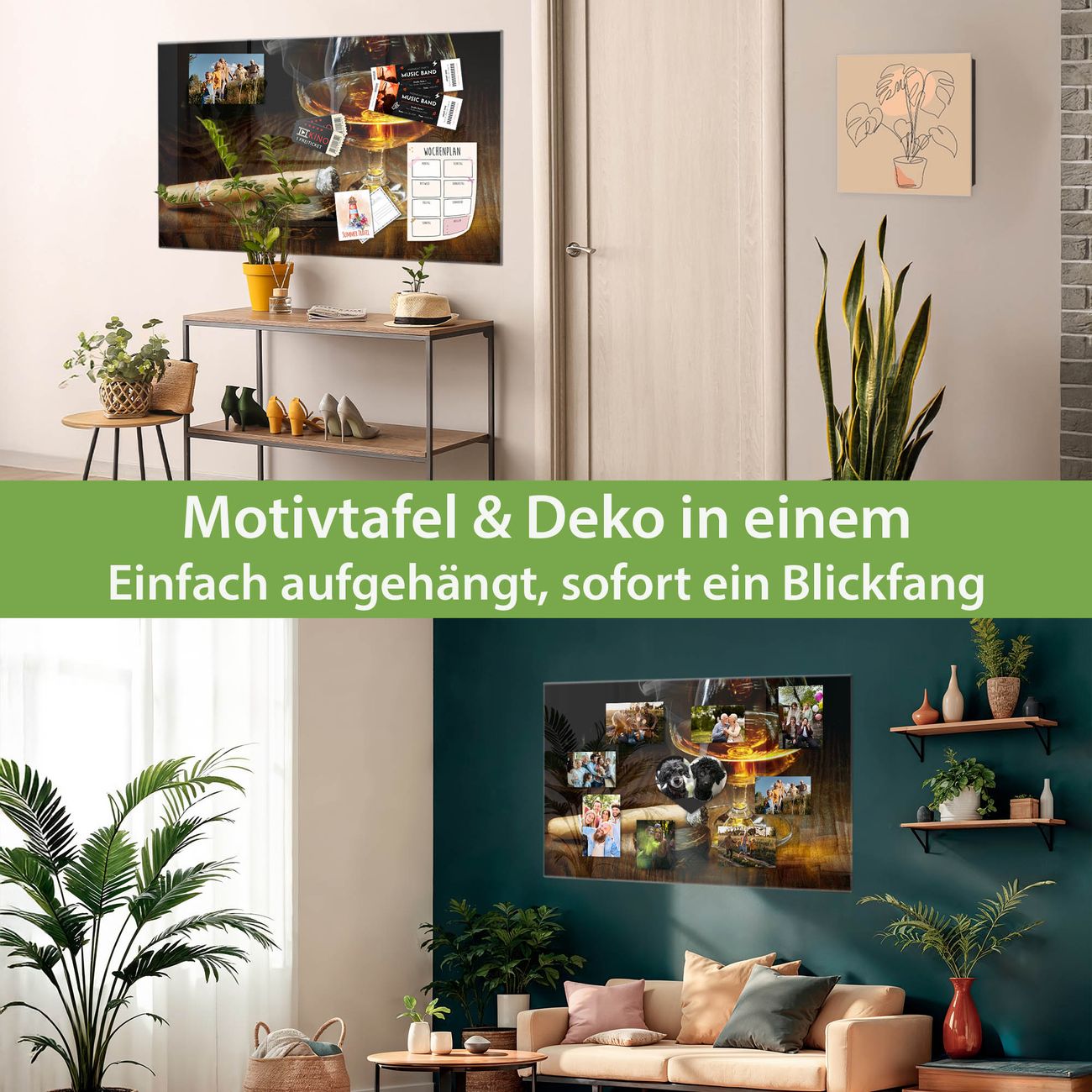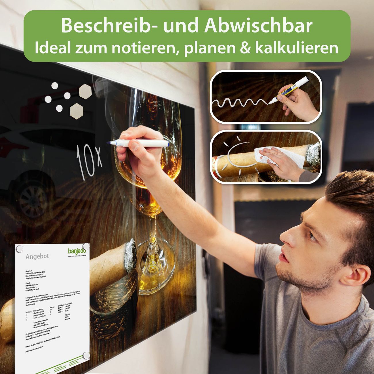 Material: 4mm Sicherheitsglas mit Metallrückwand Eigenschaften: beschreibbar, magnetisch, kratzfest Maße: 45x30x0,6cm, 2,03kg schwer Motiv Nummer 10163 Whiskey & Cigar Zubehör: inklusive 4 Neodym-Magnete