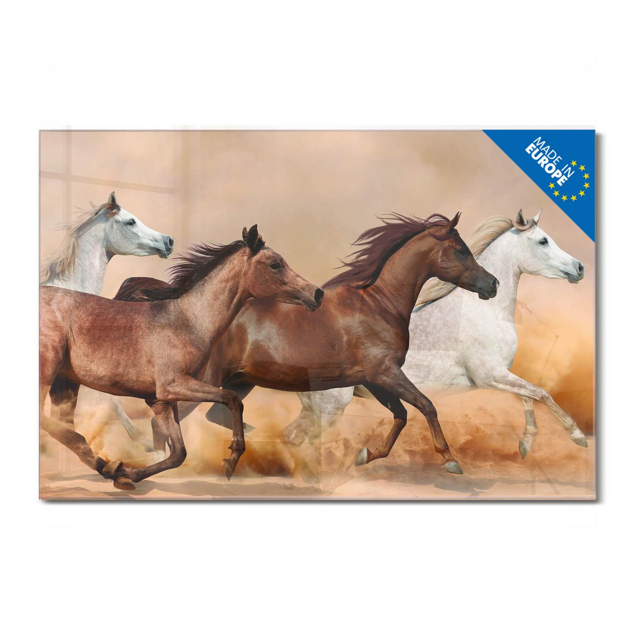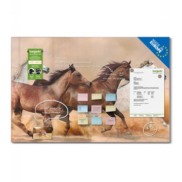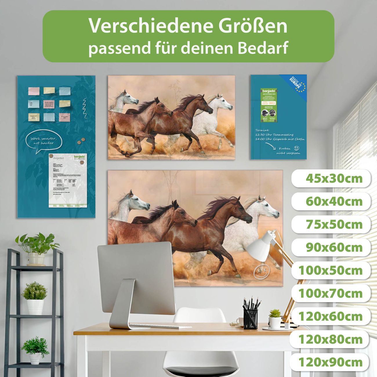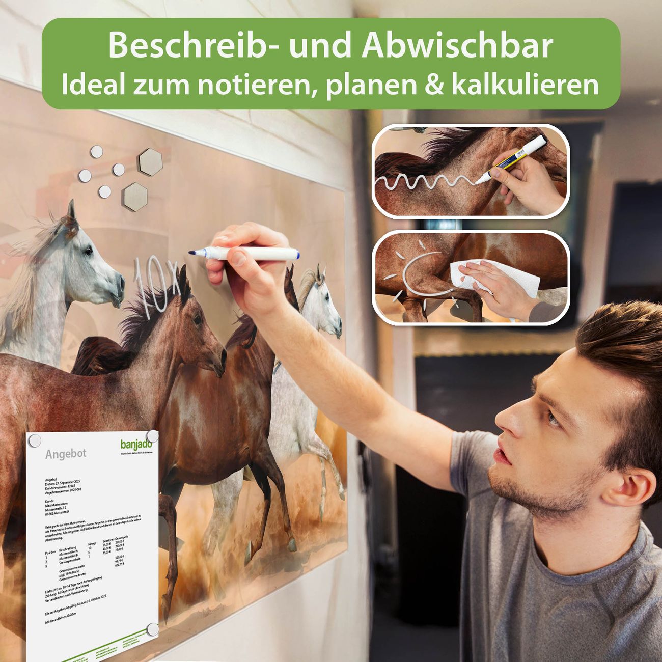 Material: 4mm Sicherheitsglas mit Metallrückwand Eigenschaften: beschreibbar, magnetisch, kratzfest Maße: 120x80x0,6cm, 14,40kg schwer Motiv Nummer 12391 Wilde Pferde Zubehör: inklusive 4 Neodym-Magnete