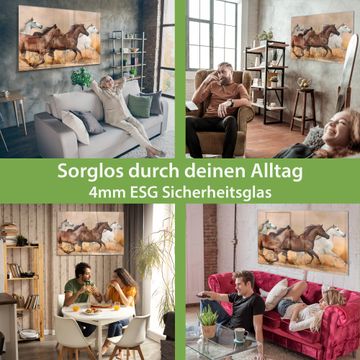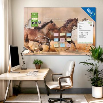 Material: 4mm Sicherheitsglas mit Metallrückwand Eigenschaften: beschreibbar, magnetisch, kratzfest Maße: 75x50x0,6cm, 5,63kg schwer Motiv Nummer 12391 Wilde Pferde Zubehör: inklusive 4 Neodym-Magnete