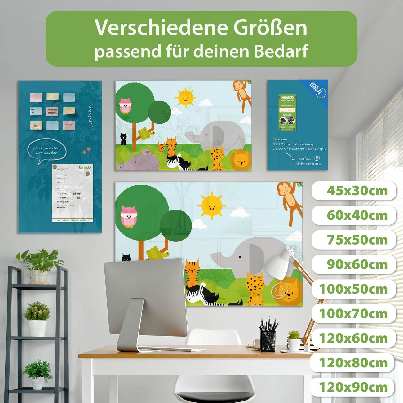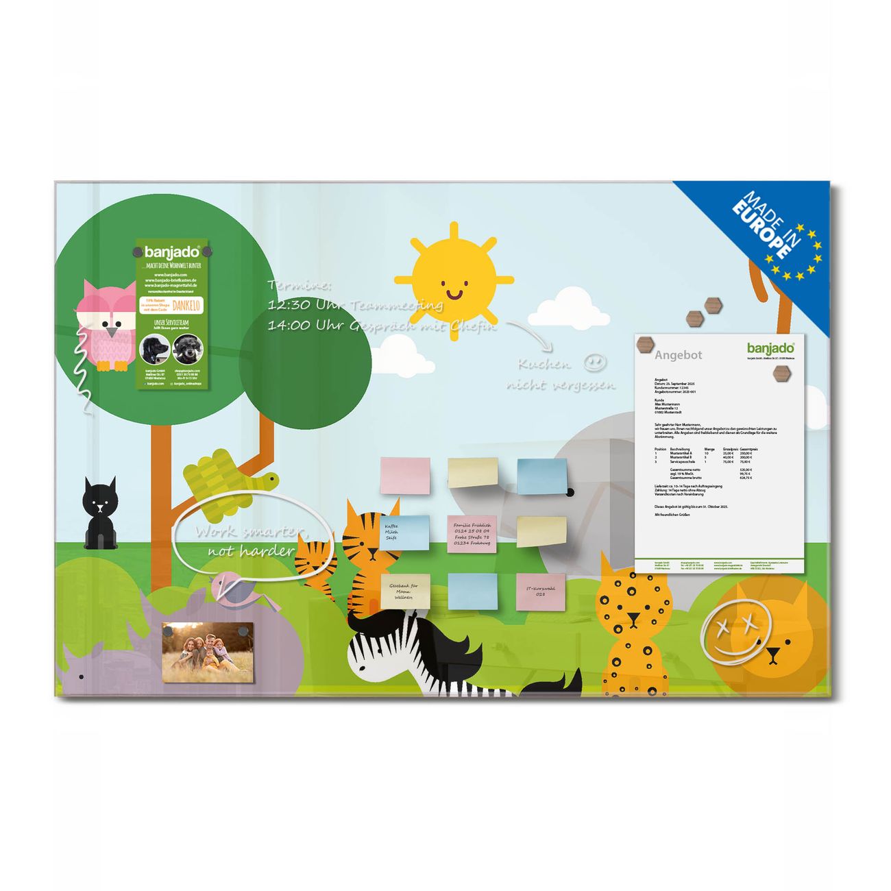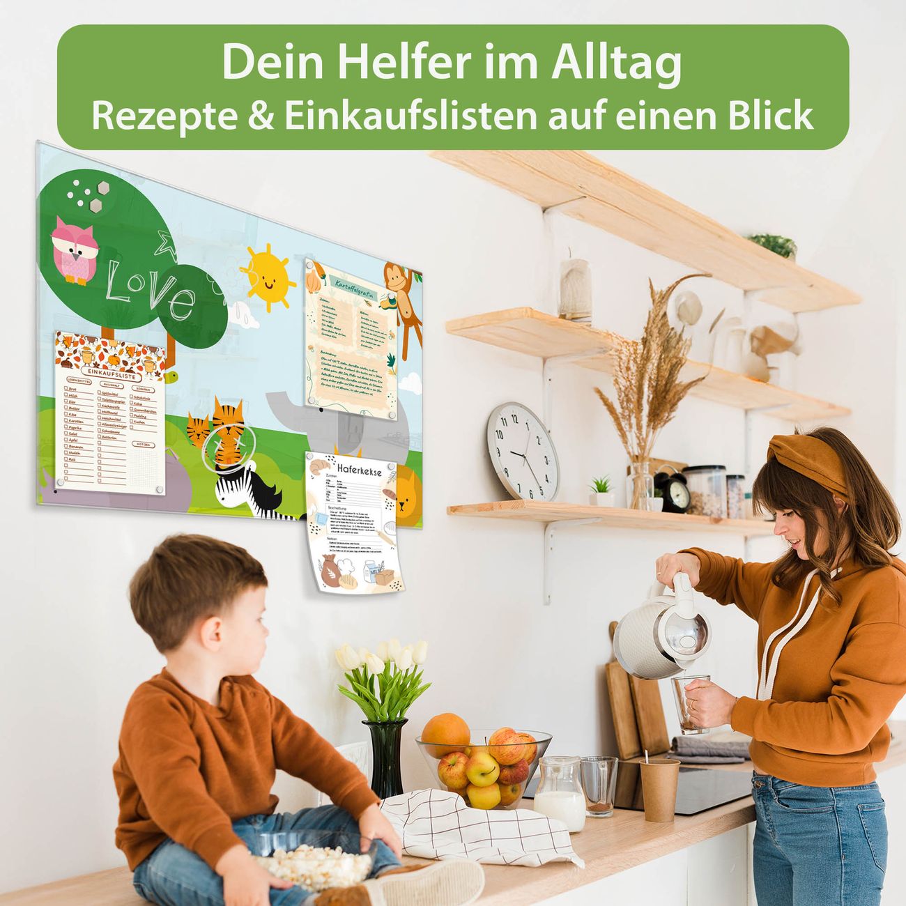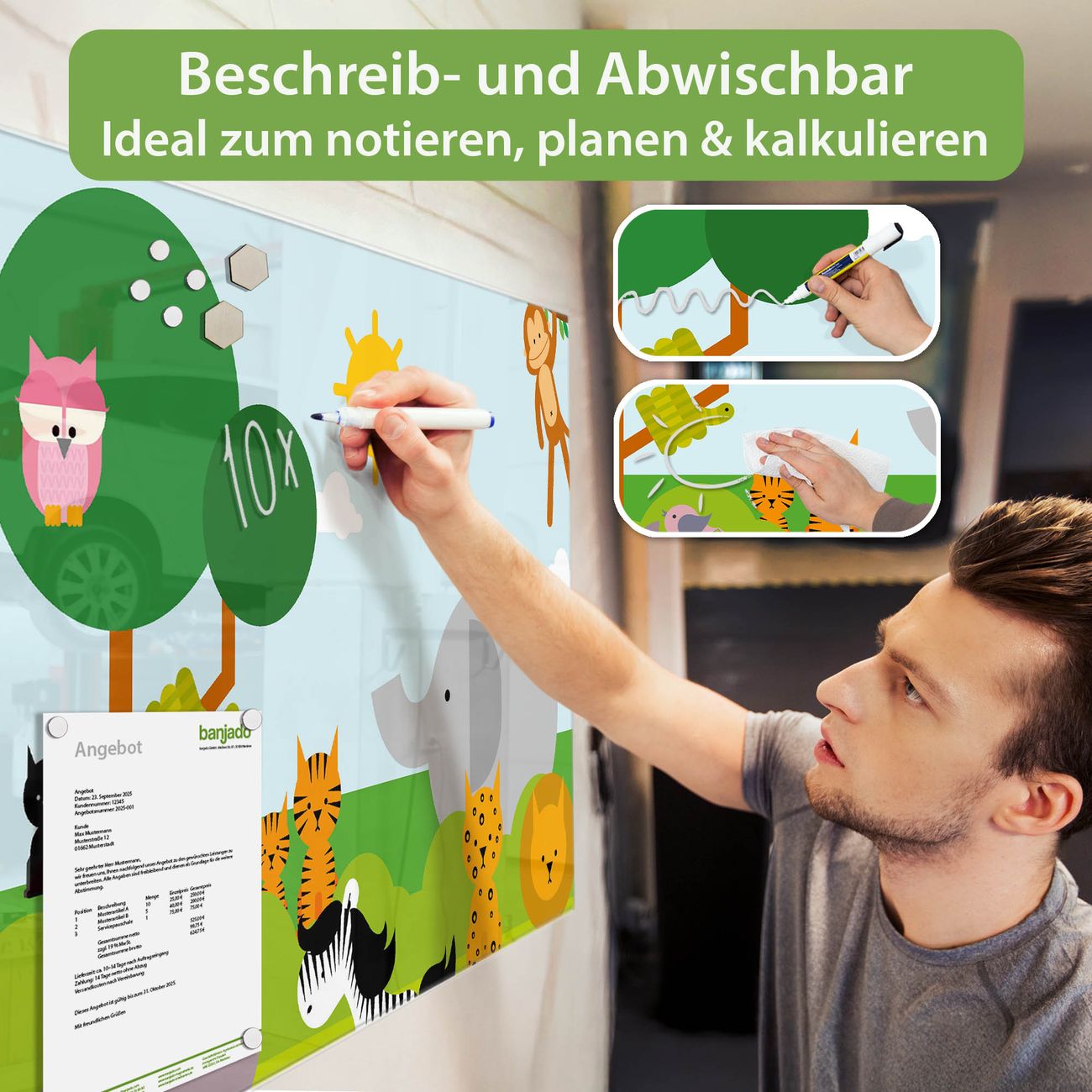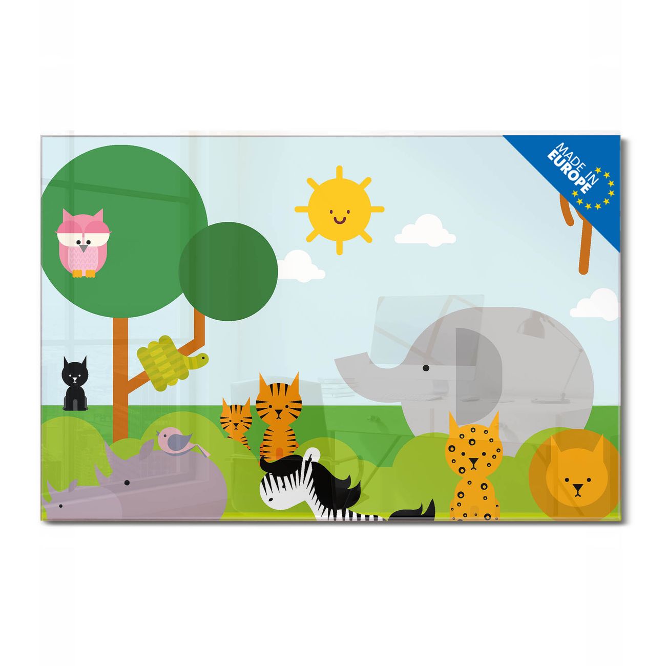 Material: 4mm Sicherheitsglas mit Metallrückwand Eigenschaften: beschreibbar, magnetisch, kratzfest Maße: 110x55x0,6cm, 9,08kg schwer Motiv Nummer 11970 Wilde Tiere Zubehör: inklusive 4 Neodym-Magnete