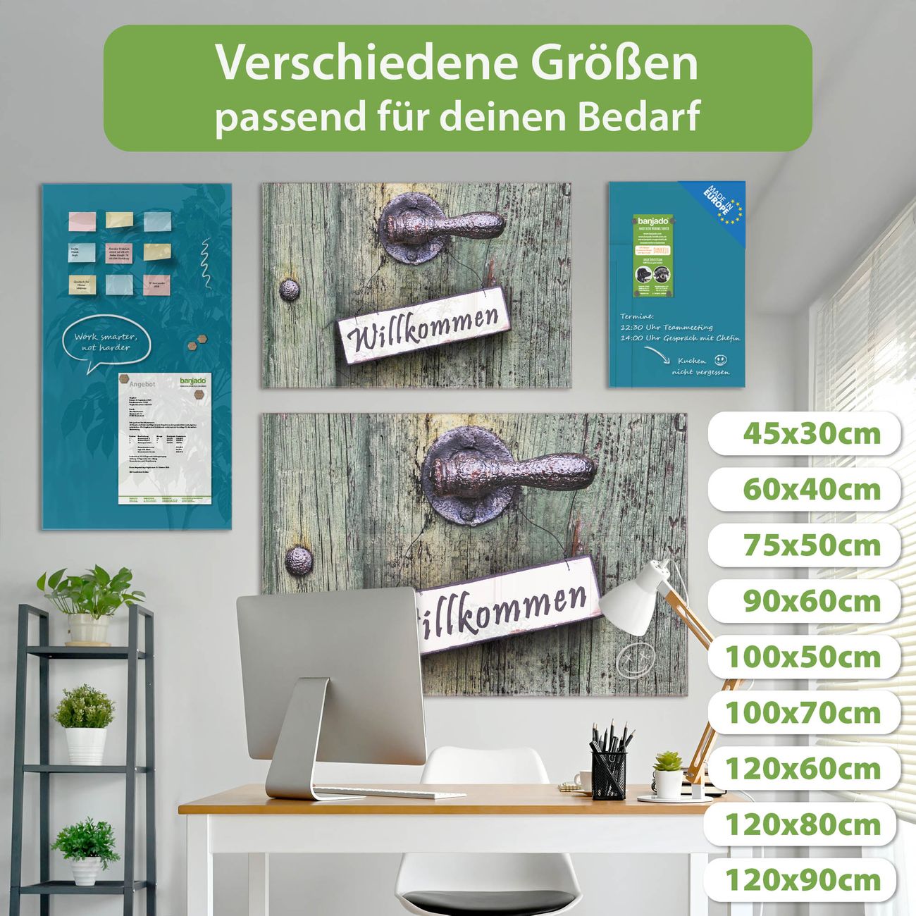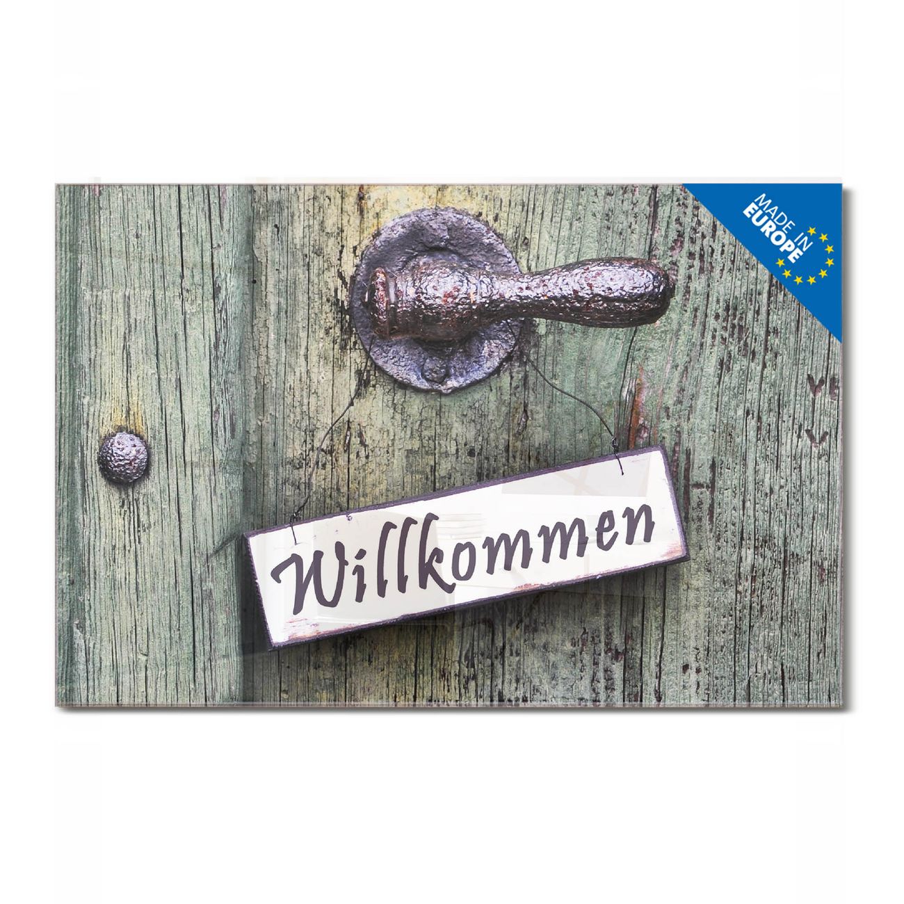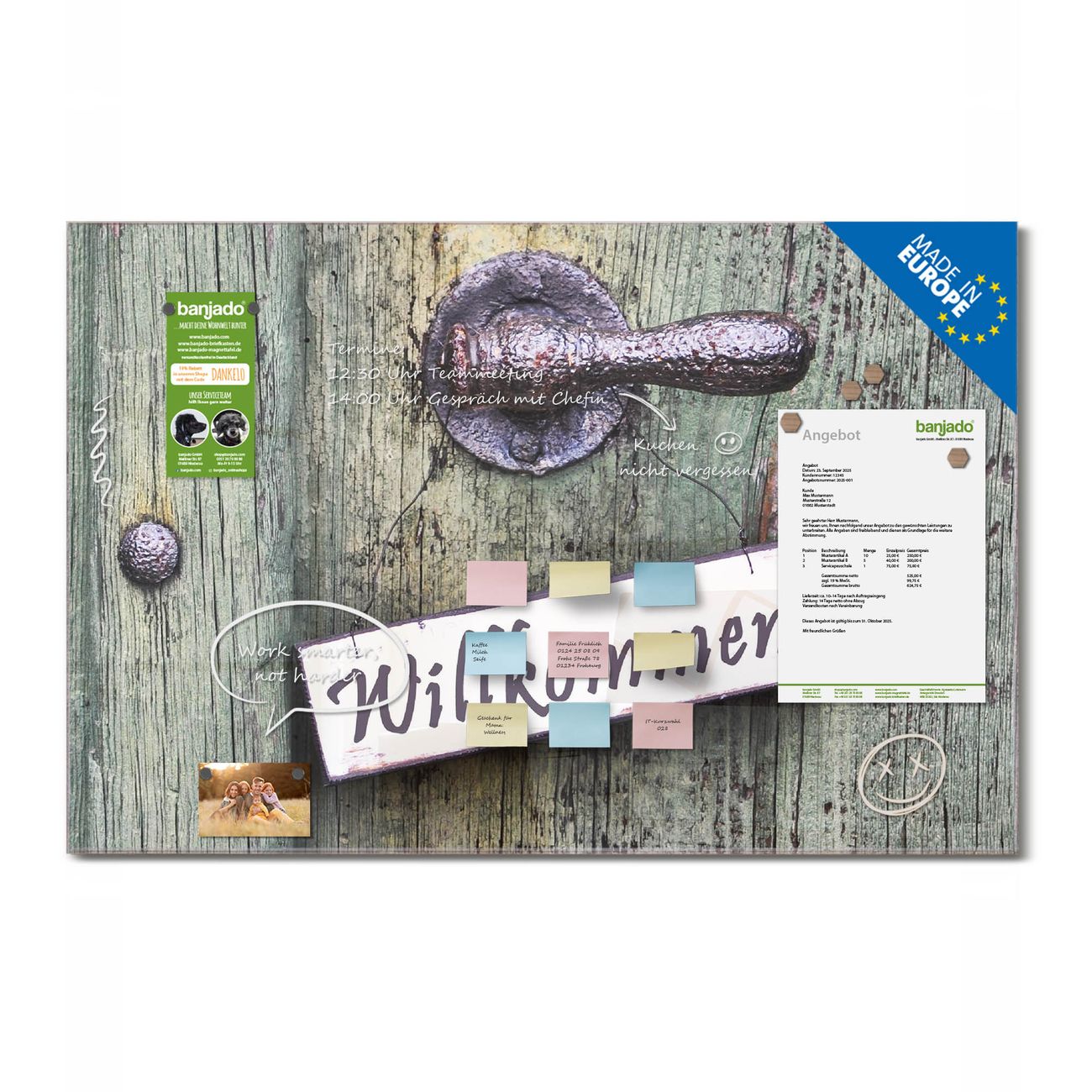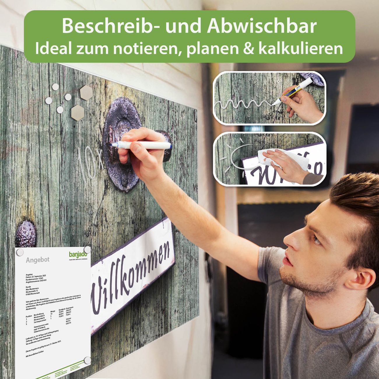 Material: 4mm Sicherheitsglas mit Metallrückwand Eigenschaften: beschreibbar, magnetisch, kratzfest Maße: 120x60x0,6cm, 10,80kg schwer Motiv Nummer 11332 Willkommen Zubehör: inklusive 4 Neodym-Magnete