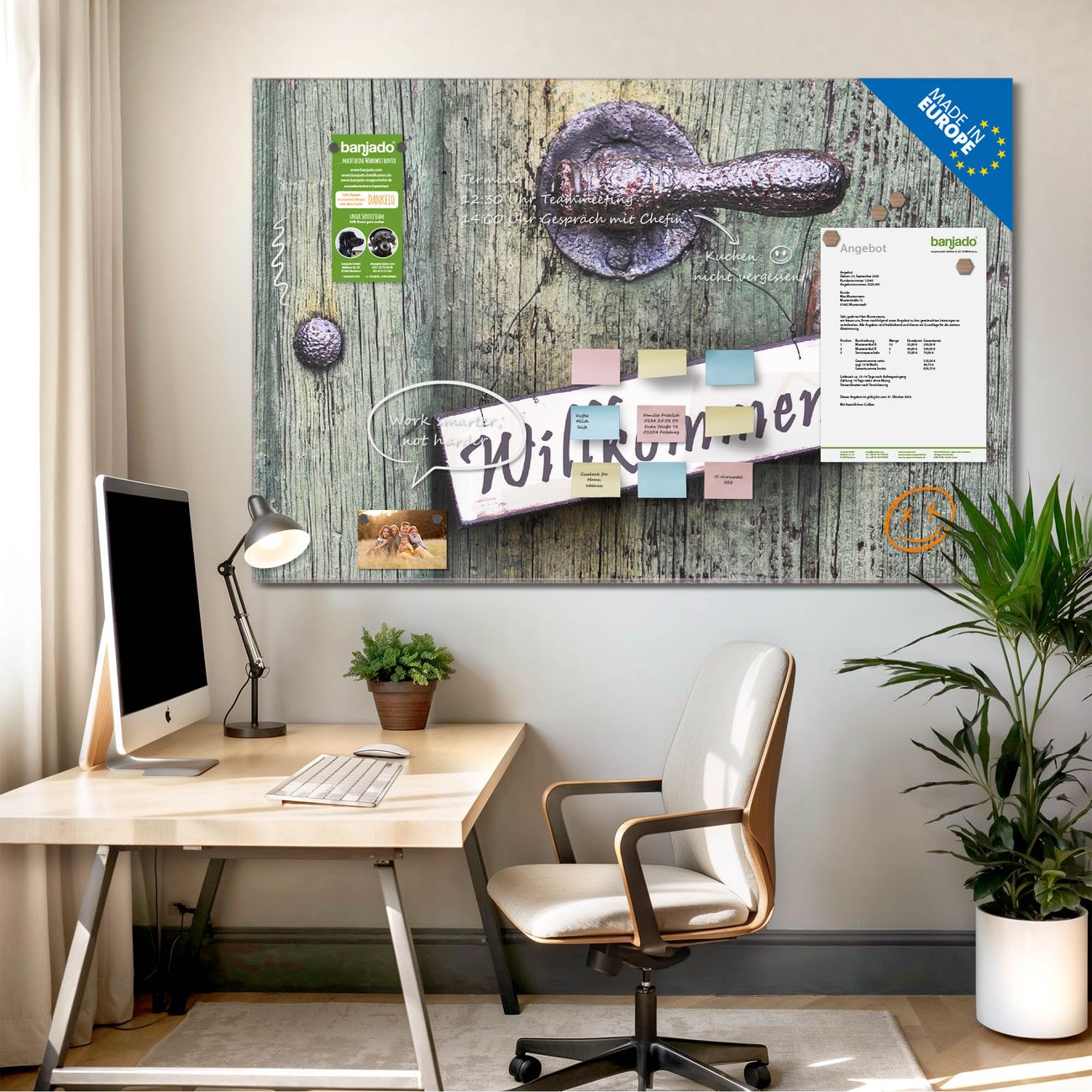 Die banjado Glas Magnettafel mit dem Motiv Motiv Willkommen verbindet Funktionalität mit Stil. Sie ersetzt das Zettelchaos durch klare Strukturen und bringt dabei eine warme, natürliche Atmosphäre in Ihr Zuhause. Ob im Büro, in der Küche oder im Eingangsbereich - dieses Design-Board zieht Blicke an und sorgt für Ordnung mit Charakter.