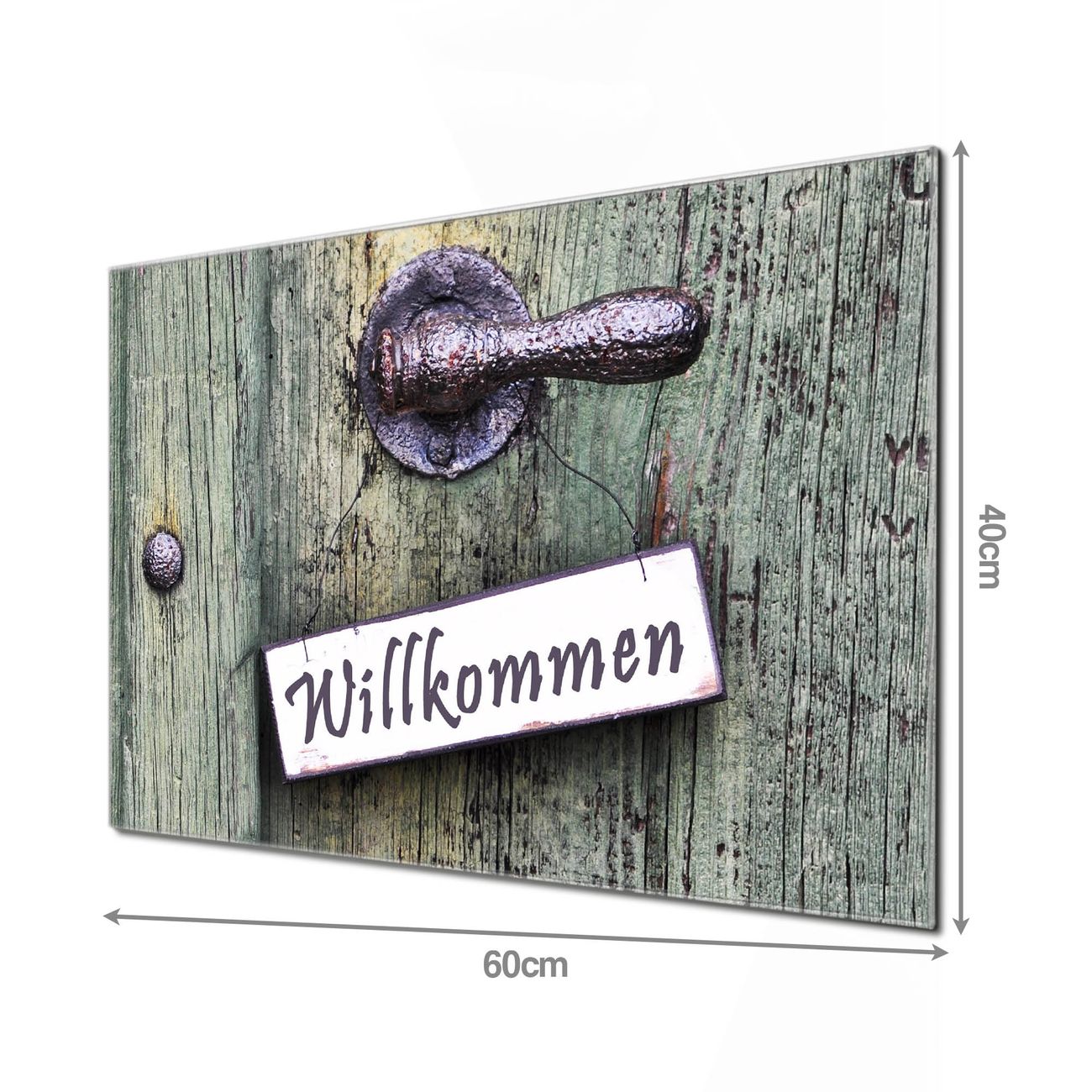 Material  4mm Sicherheitsglas mit Metallrückwand Eigenschaften  beschreibbar, magnetisch, kratzfest Maße  60x40x0,6cm, 3,6kg schwer Motiv  Nummer 11332 Willkommen Zubehör  inklusive 4 Neodym-Magnete
