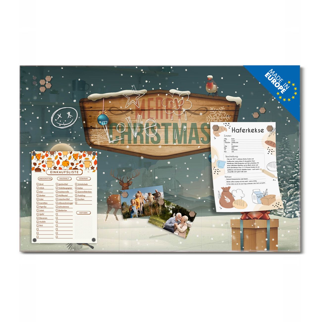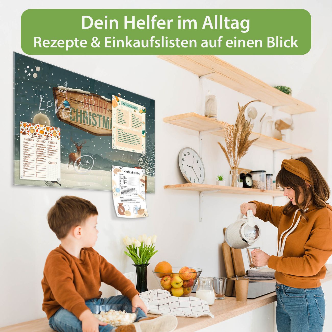 Material: 4mm Sicherheitsglas mit Metallrückwand Eigenschaften: beschreibbar, magnetisch, kratzfest Maße: 120x60x0,6cm, 10,80kg schwer Motiv Nummer 12543 Weihnachtsland Zubehör: inklusive 4 Neodym-Magnete