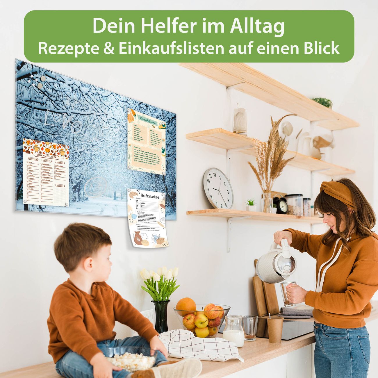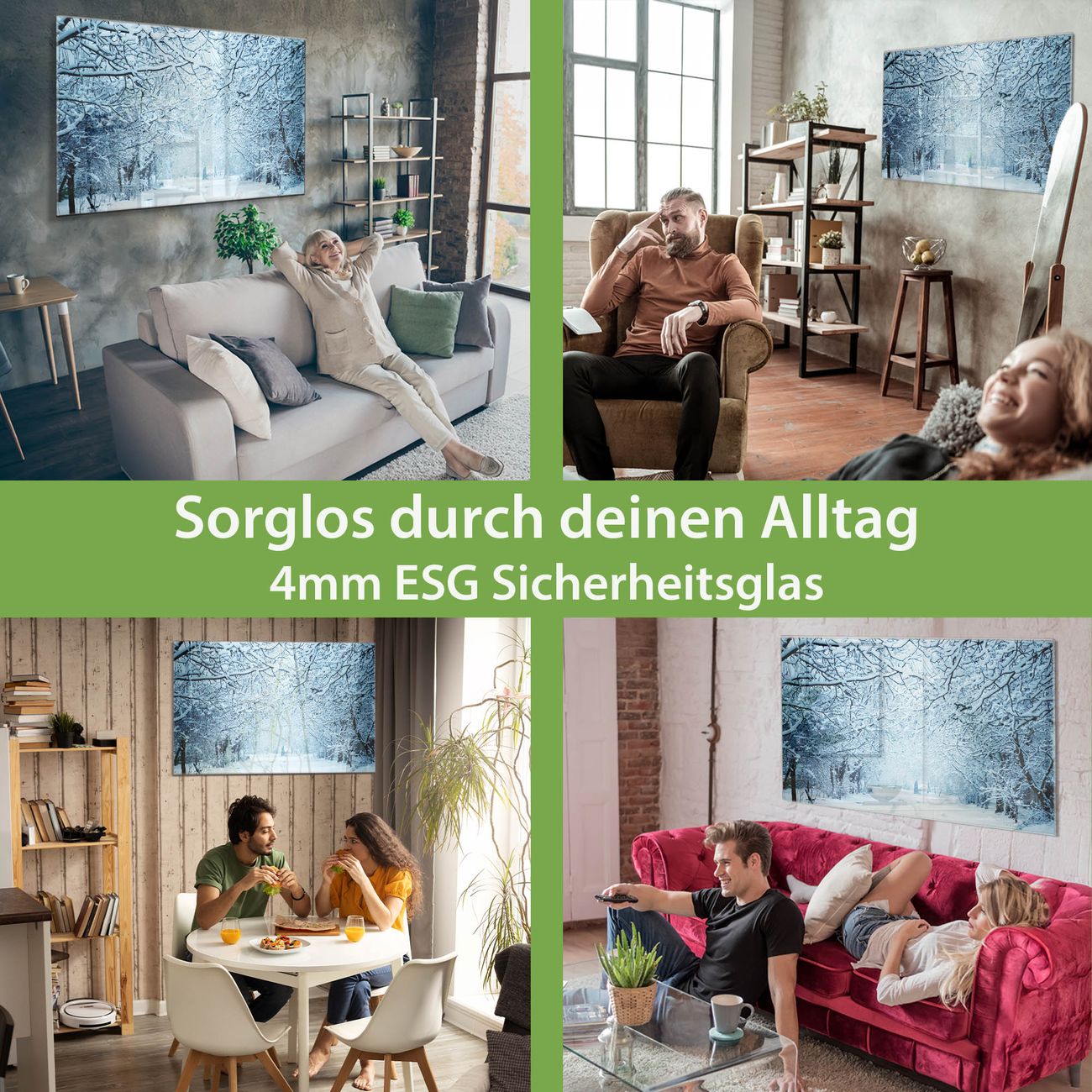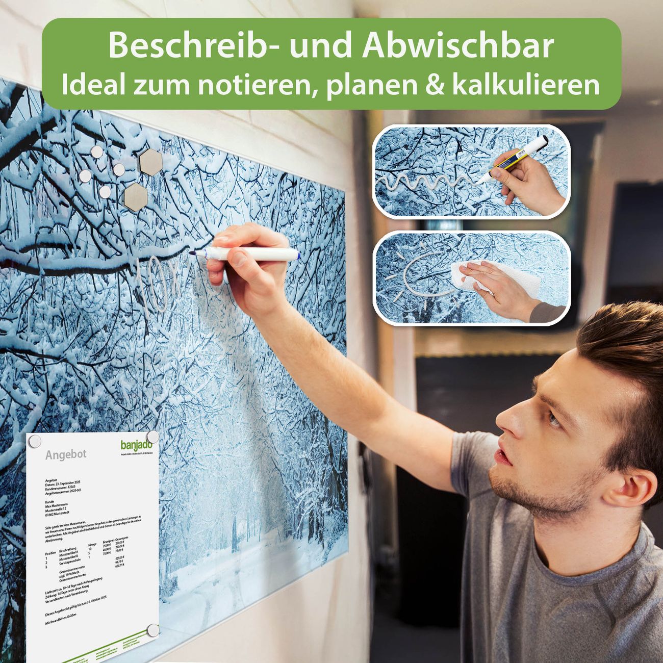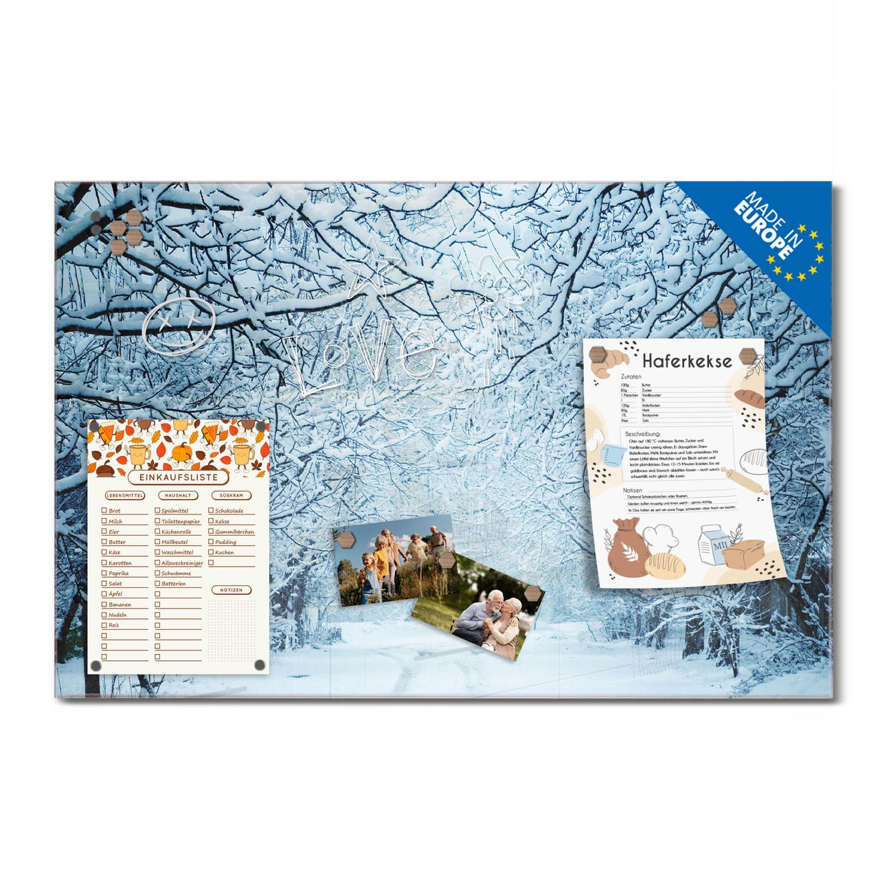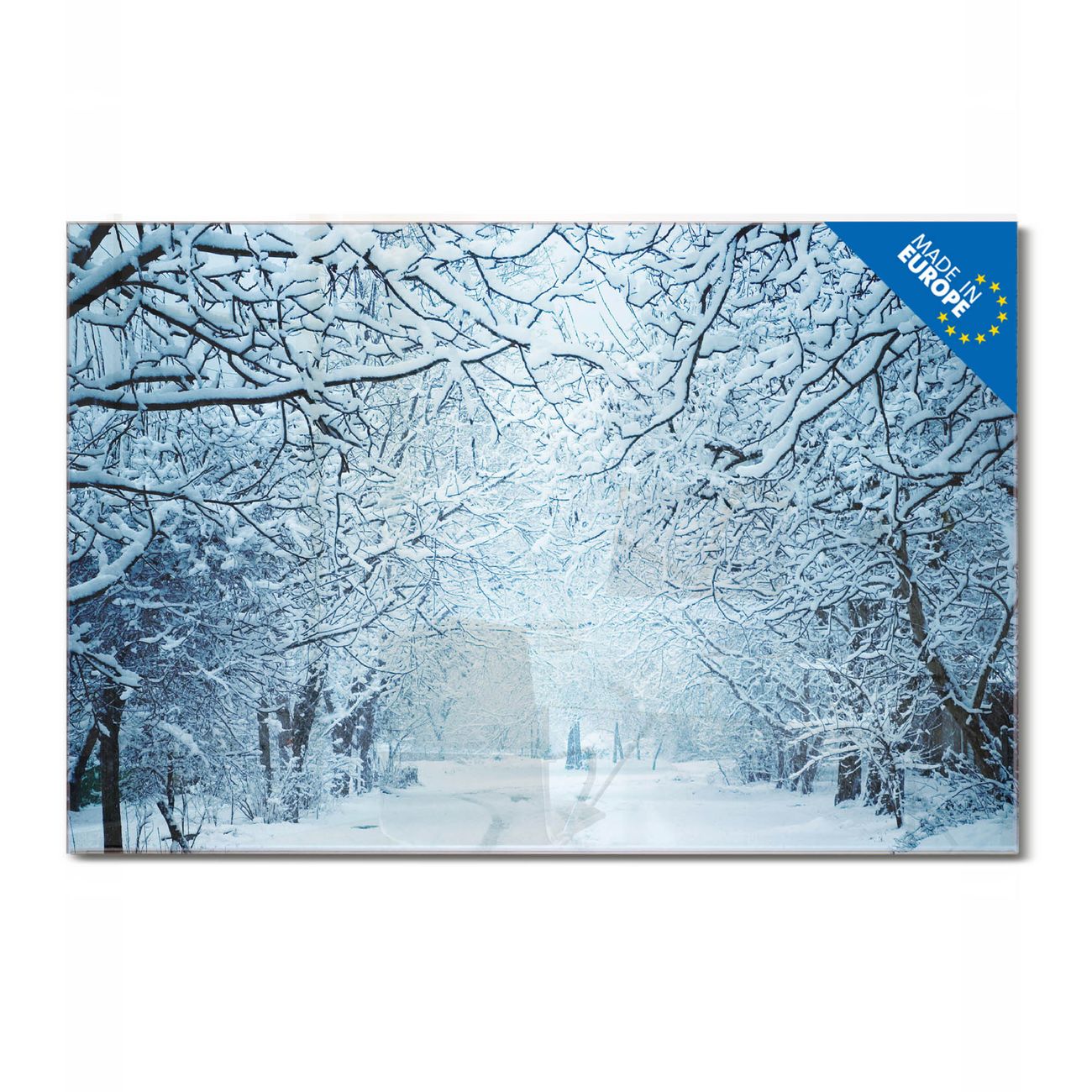 Material: 4mm Sicherheitsglas mit Metallrückwand Eigenschaften: beschreibbar, magnetisch, kratzfest Maße: 120x60x0,6cm, 10,80kg schwer Motiv Nummer 12293 Winterspaziergang Zubehör: inklusive 4 Neodym-Magnete