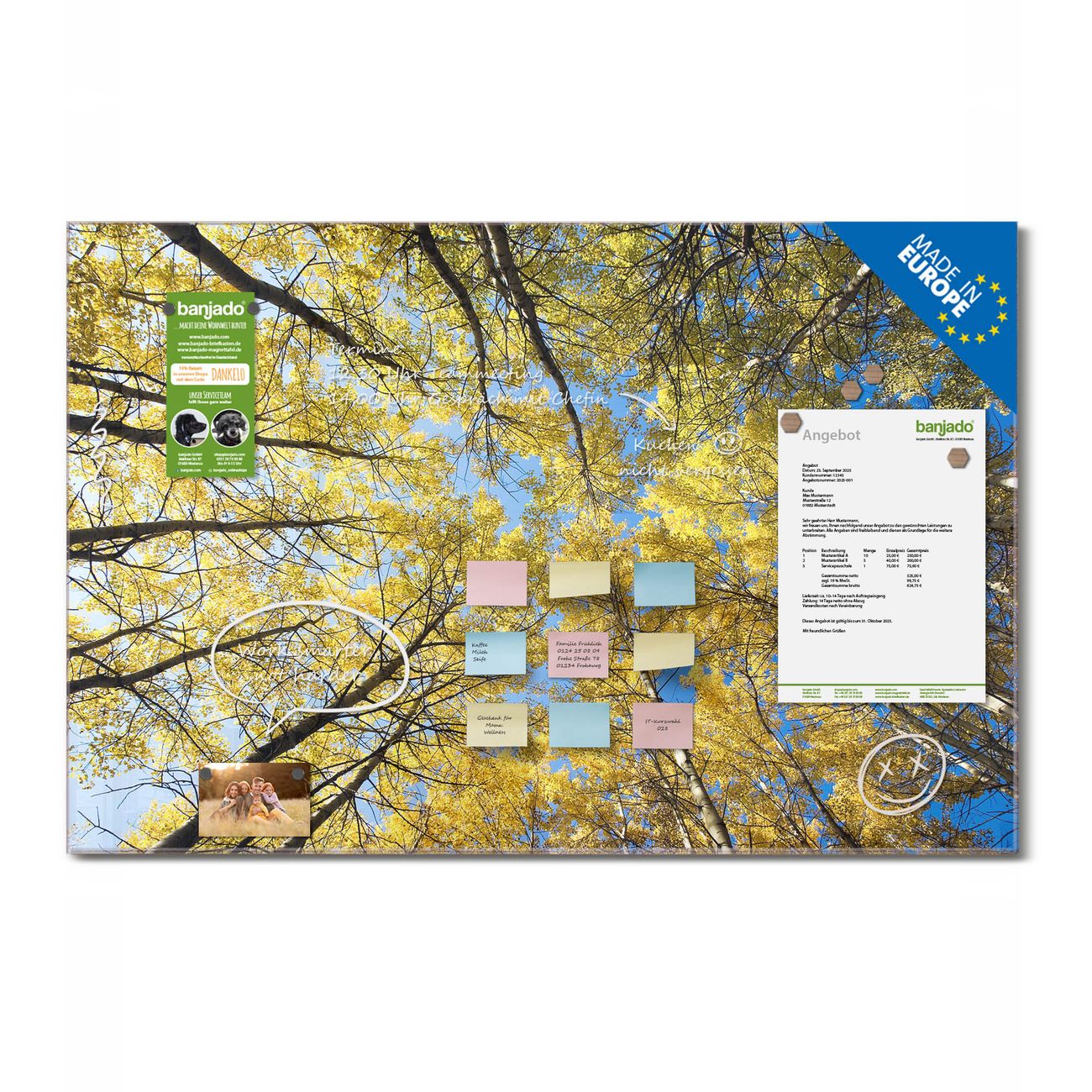 Jede Glas Magnettafel wird in unserer Werkstatt von Hand gefertigt und sorgfältig geprüft. So erhalten Sie ein echtes Qualitätsprodukt, das Funktion und Ästhetik perfekt vereint.?? Warum banjado?
