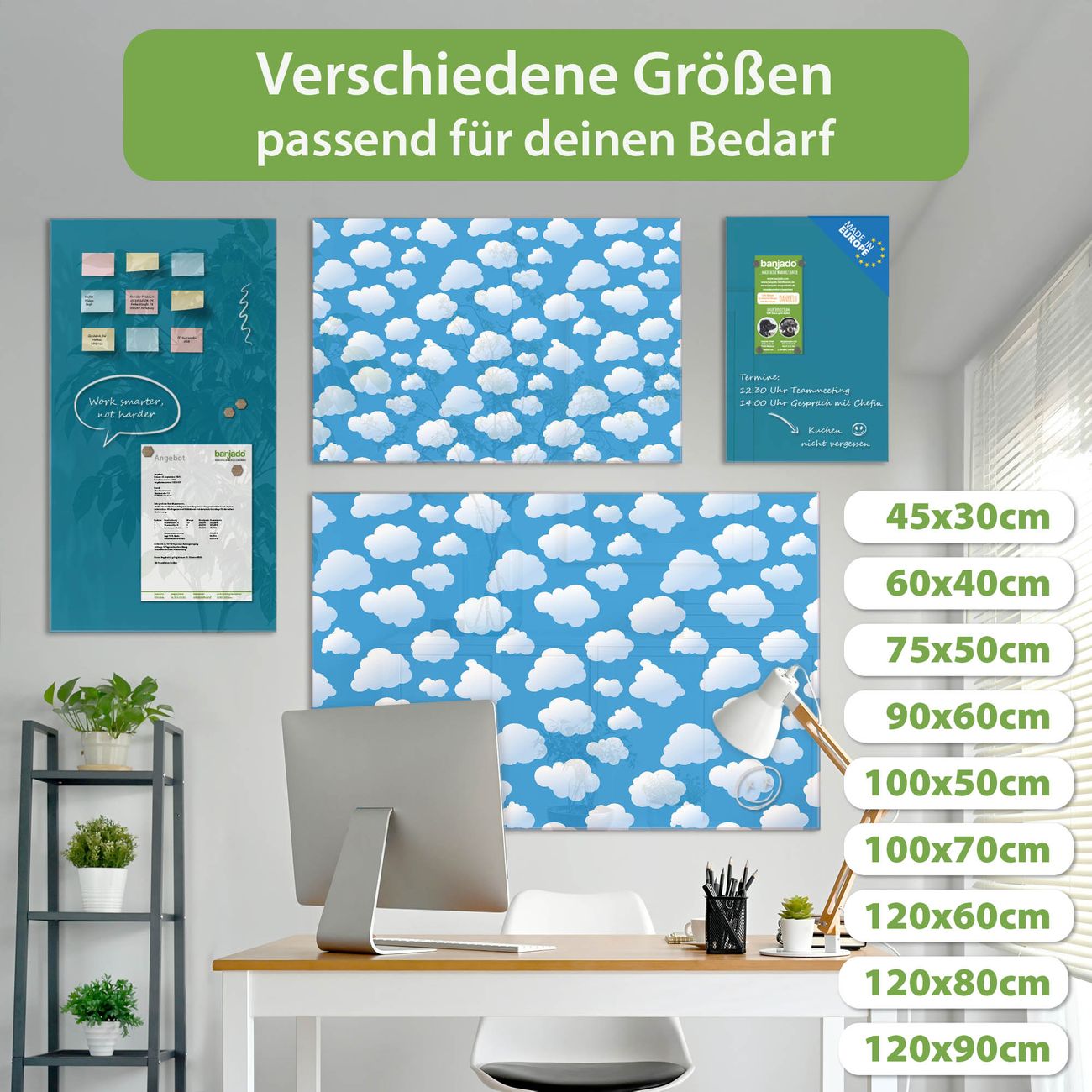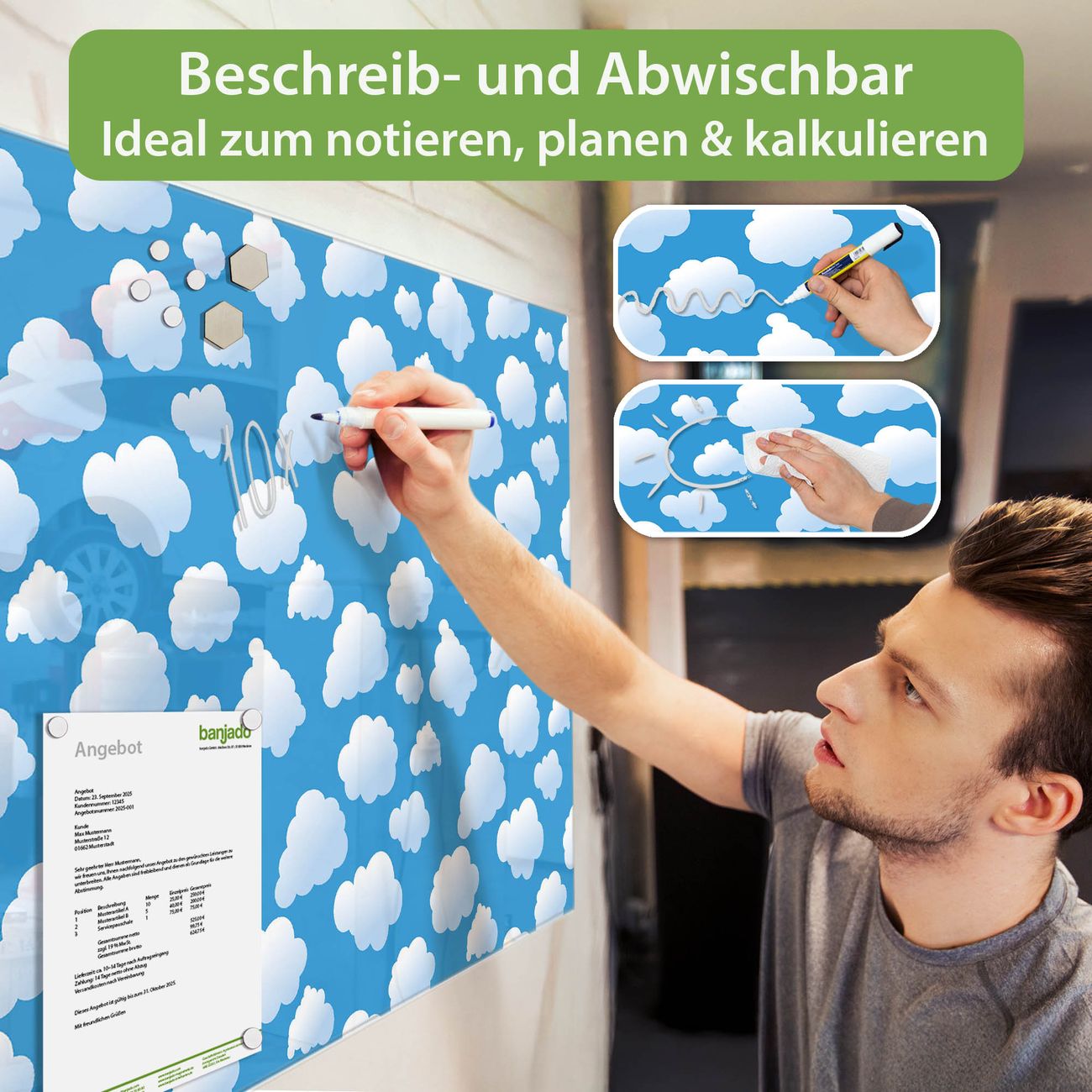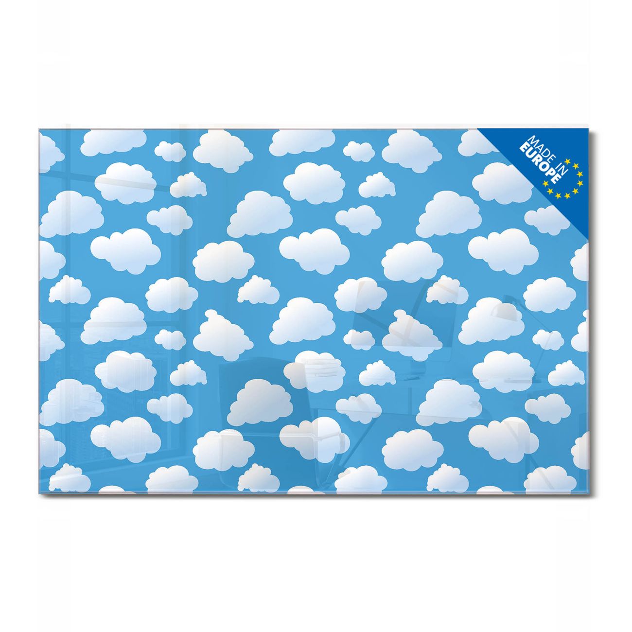 Material: 4mm Sicherheitsglas mit Metallrückwand Eigenschaften: beschreibbar, magnetisch, kratzfest Maße: 100x50x0,6cm, 7,50kg schwer Motiv Nummer 10055 Wölkchen Zubehör: inklusive 4 Neodym-Magnete