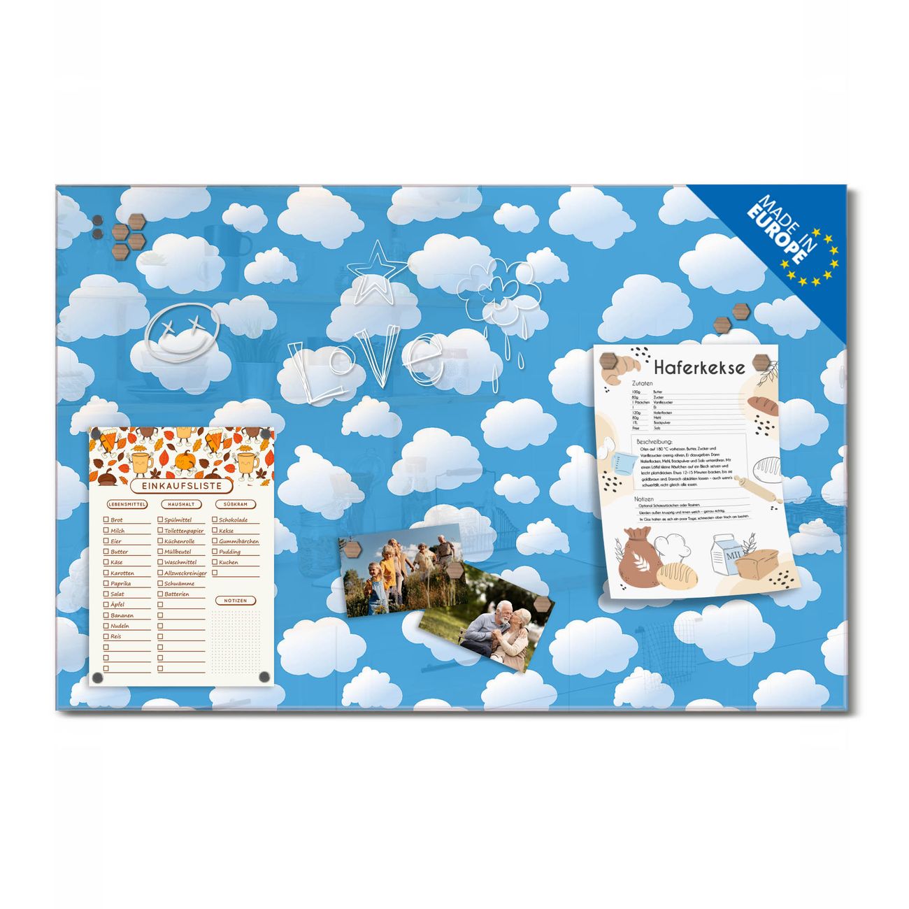 Ein Stück Design, das Ihren Alltag organisiert. Schreiben, heften, inspirieren - alles an einem Ort. Qualität, die man spürt. Montage leicht gemacht. Handwerk mit Herz - veredelt in Sachsen. Einzigartiges Design mit Motiv Motiv Wölkchen Beschreibbare Glasoberfläche, leicht zu reinigen Starke Magnetkraft durch Stahlrückwand Inklusive 4 Neodym-Magneten Flexible Montageoptionen Handveredelt in Sachsen - Qualität, die bleibt