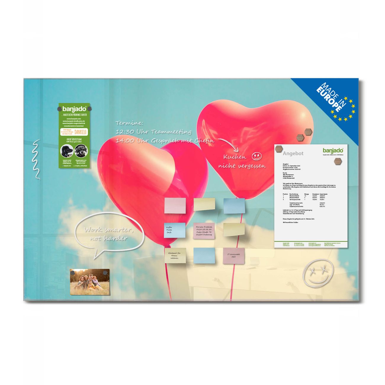 Material: 4mm Sicherheitsglas mit Metallrückwand Eigenschaften: beschreibbar, magnetisch, kratzfest Maße: 120x80x0,6cm, 14,40kg schwer Motiv Nummer 11369 Wolke Sieben Zubehör: inklusive 4 Neodym-Magnete