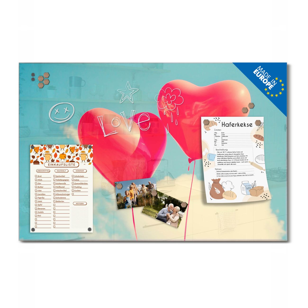 Ein Stück Design, das Ihren Alltag organisiert. Schreiben, heften, inspirieren - alles an einem Ort. Qualität, die man spürt. Montage leicht gemacht. Handwerk mit Herz - veredelt in Sachsen. Einzigartiges Design mit Motiv Motiv Wolke Sieben Beschreibbare Glasoberfläche, leicht zu reinigen Starke Magnetkraft durch Stahlrückwand Inklusive 4 Neodym-Magneten Flexible Montageoptionen Handveredelt in Sachsen - Qualität, die bleibt
