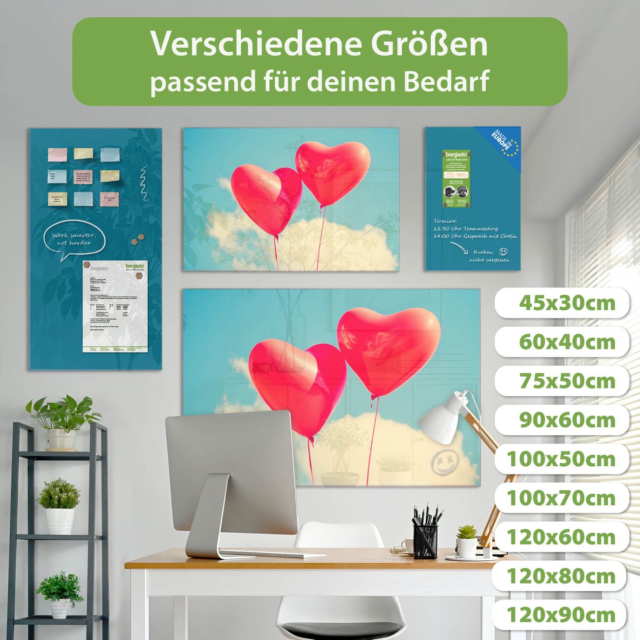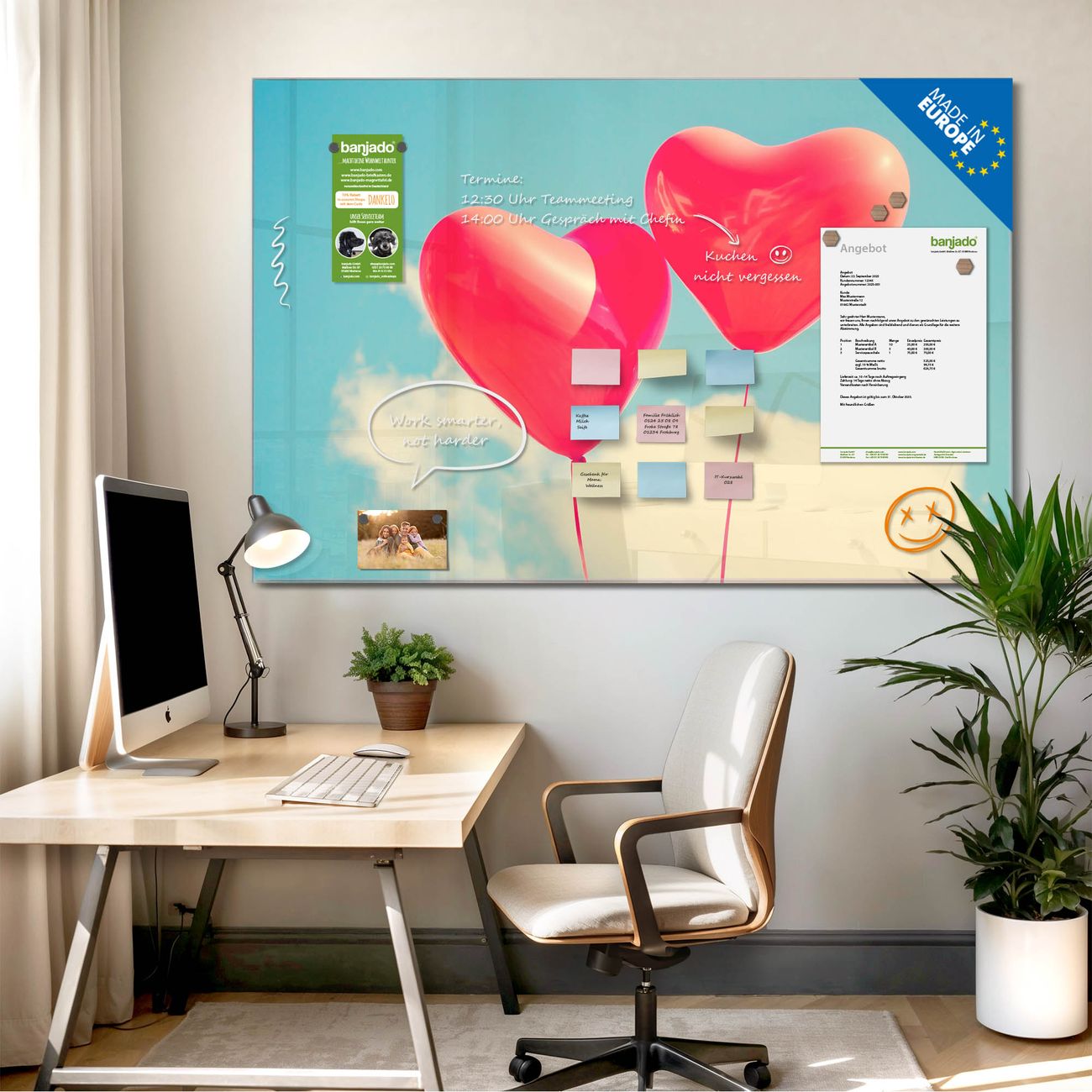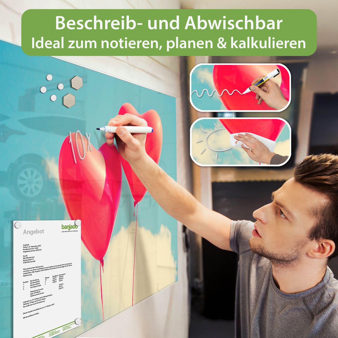 Jede Glas Magnettafel wird in unserer Werkstatt von Hand gefertigt und sorgfältig geprüft. So erhalten Sie ein echtes Qualitätsprodukt, das Funktion und Ästhetik perfekt vereint.?? Warum banjado?