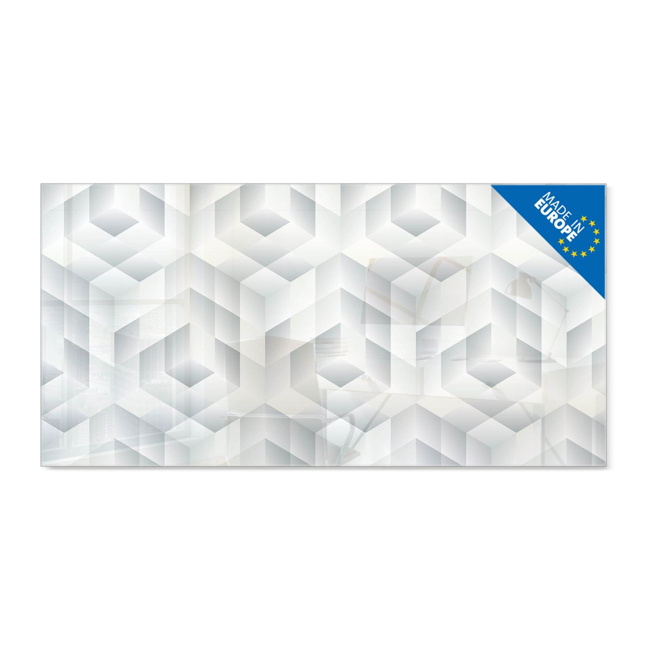 Material: 4mm Sicherheitsglas mit Metallrückwand Eigenschaften: beschreibbar, magnetisch, kratzfest Maße: 100x50x0,6cm, 7,50kg schwer Motiv Nummer 11634 Würfel Grau Zubehör: inklusive 4 Neodym-Magnete