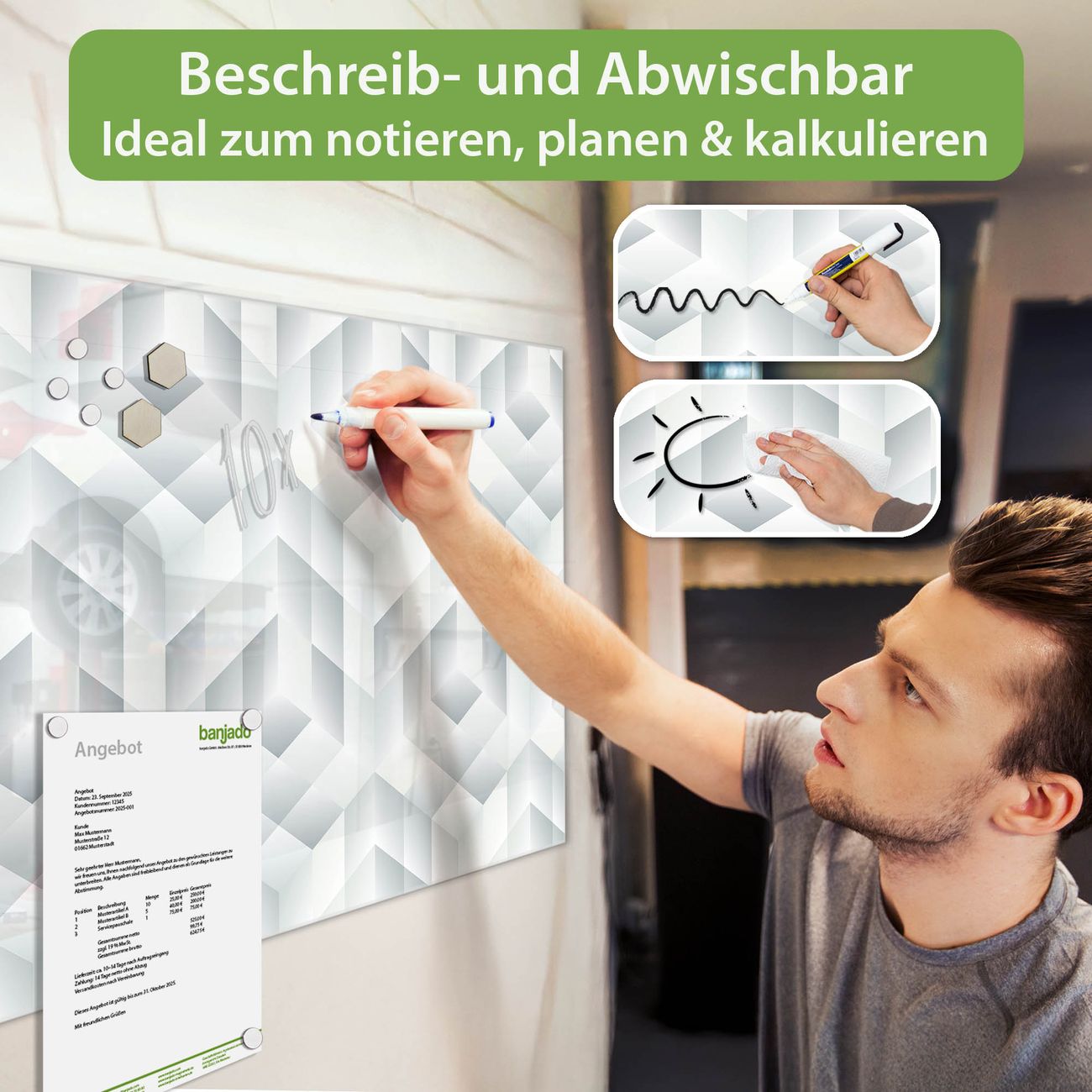 Die banjado Glas Magnettafel mit dem Motiv Motiv Würfel Grau verbindet Funktionalität mit Stil. Sie ersetzt das Zettelchaos durch klare Strukturen und bringt dabei eine warme, natürliche Atmosphäre in Ihr Zuhause. Ob im Büro, in der Küche oder im Eingangsbereich - dieses Design-Board zieht Blicke an und sorgt für Ordnung mit Charakter.