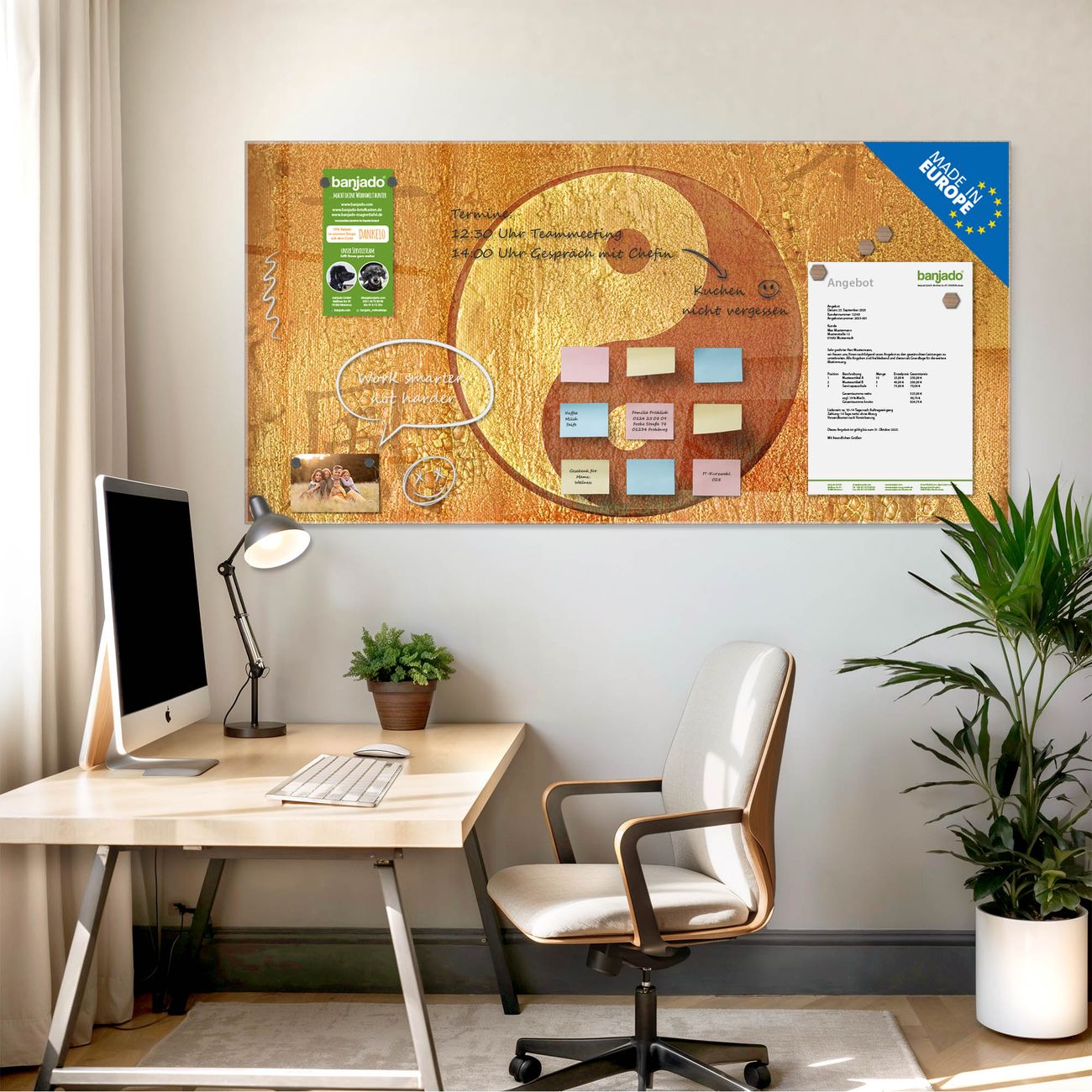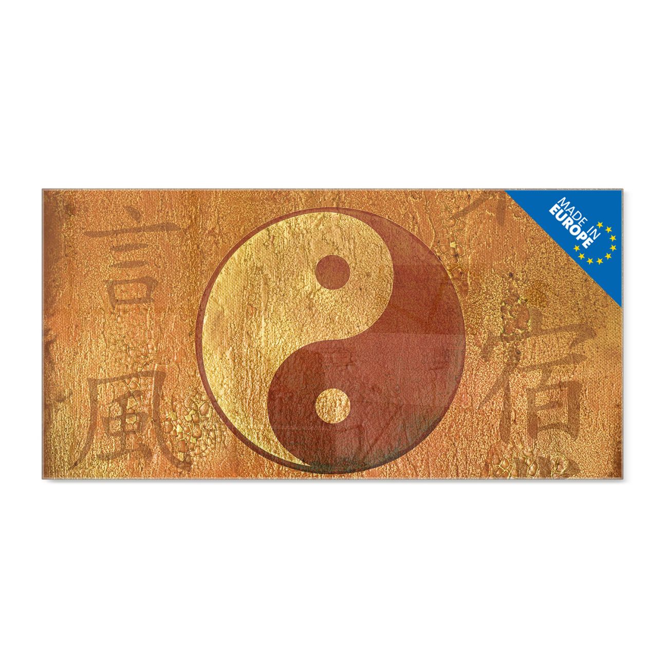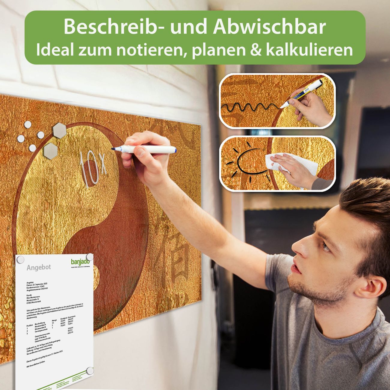 Material: 4mm Sicherheitsglas mit Metallrückwand Eigenschaften: beschreibbar, magnetisch, kratzfest Maße: 100x50x0,6cm, 7,50kg schwer Motiv Nummer 12054 Yin Yang Zubehör: inklusive 4 Neodym-Magnete
